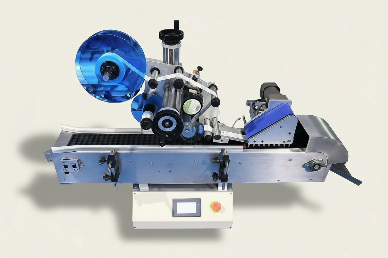 Вертикальная подача тары, предназначен для этикетирования узких цилиндрических тар. Автоматический этикетировщик представляет собой настольную установку горизонтального типа с приводным цепным рольгангом и бункером подачи тары.