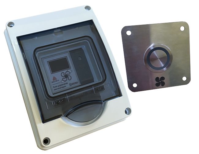 Включение/выключение осуществляется либо при помощи влагозащищённой кнопки со встроенной подсветкой (ручной режим), либо по сигналу от датчика концентрации CO2 (автоматический режим). В ручном режиме время работы вентилятора программируется с помощью индикатора и кнопки на блоке управления, в автоматическом – зависит от текущей концентрации CO2.