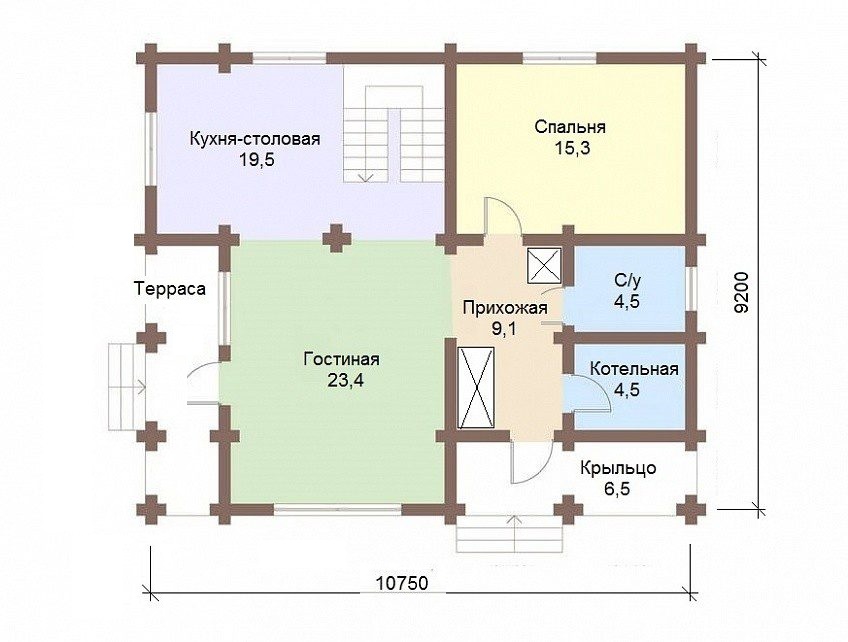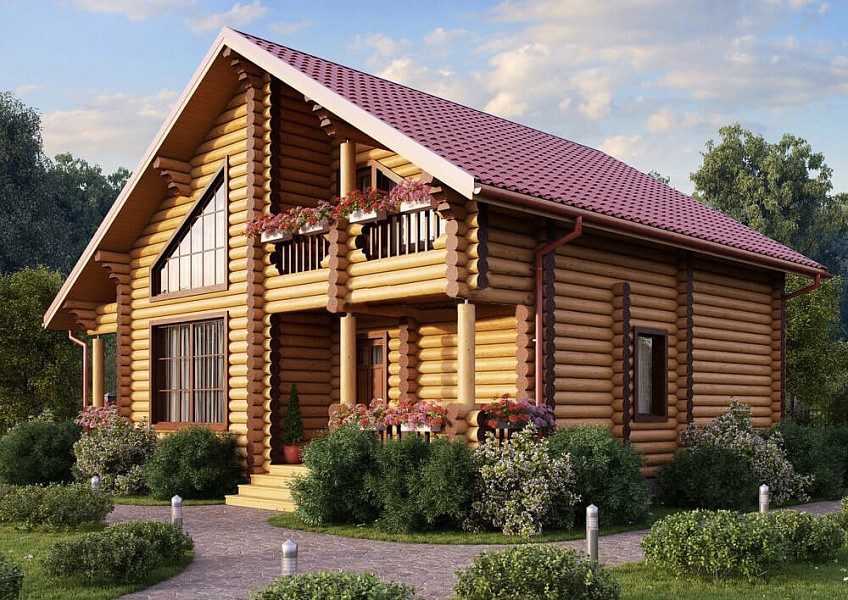 В стоимость входит: фундамент на железобетонных сваях, обвязка из бруса 200х200 мм, лаги пола 100х200 мм, стеновой комплект с монтажом из оцилиндрованного бревна диаметром 200 мм, крыша с покрытием из металлочерепицы