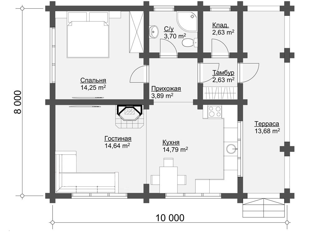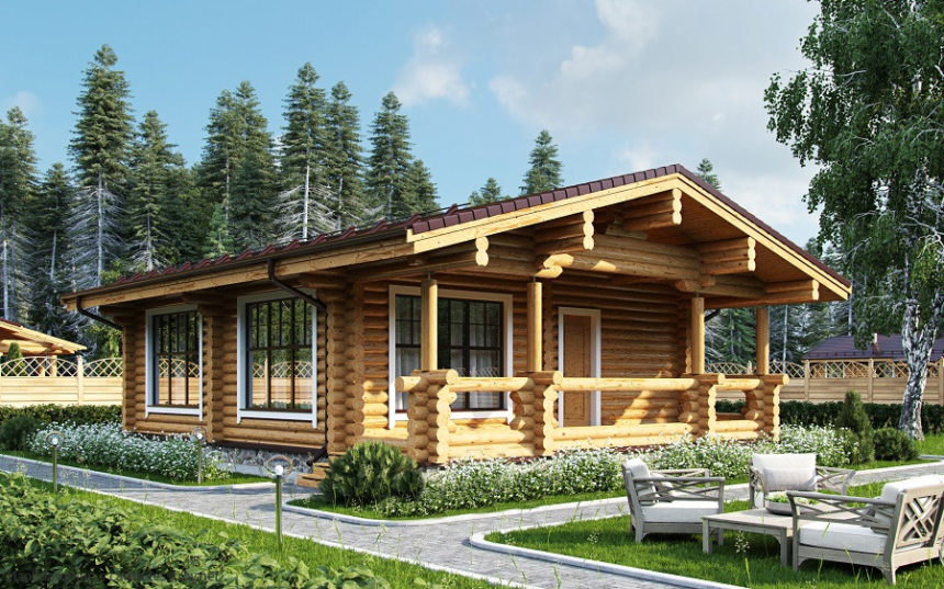Великолепный одноэтажный дом с панорамным остеклением по проекту «Геракл» выполнен из оцилиндрованного бревна. Возможны варианты из бревна диаметром 180, 200, 220, 240, 260, 280, 300 мм. Небольшой одноэтажный дом отлично подойдет в качестве дачного дома. Проектом предусмотрен минимальный набор необходимых помещений: просторные гостиная-кухня, спальня и санузел, а также красивая терраса.