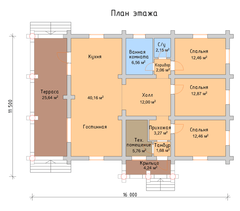 Великолепный просторный одноэтажный дом по проекту «Геркулес» выполнен из оцилиндрованного бревна. Возможны варианты из бревна диаметром 180, 200, 220, 240, 260, 280, 300 мм. Данный проект отлично подойдет для любителей одноэтажных домов. Проектом предусмотрены три спальные комнаты просторные гостиная с кухней с выходом на террасу. Основной вход осуществляется с бокового фасада через крыльцо.