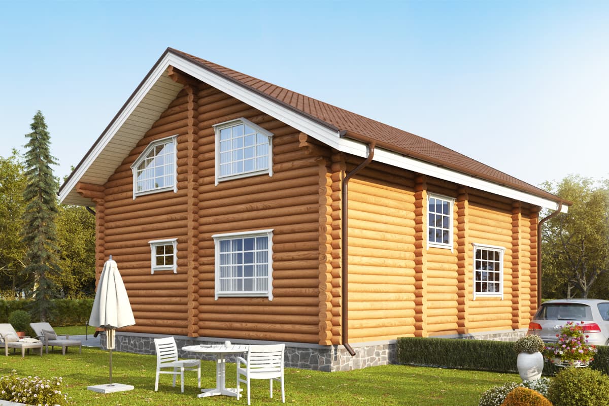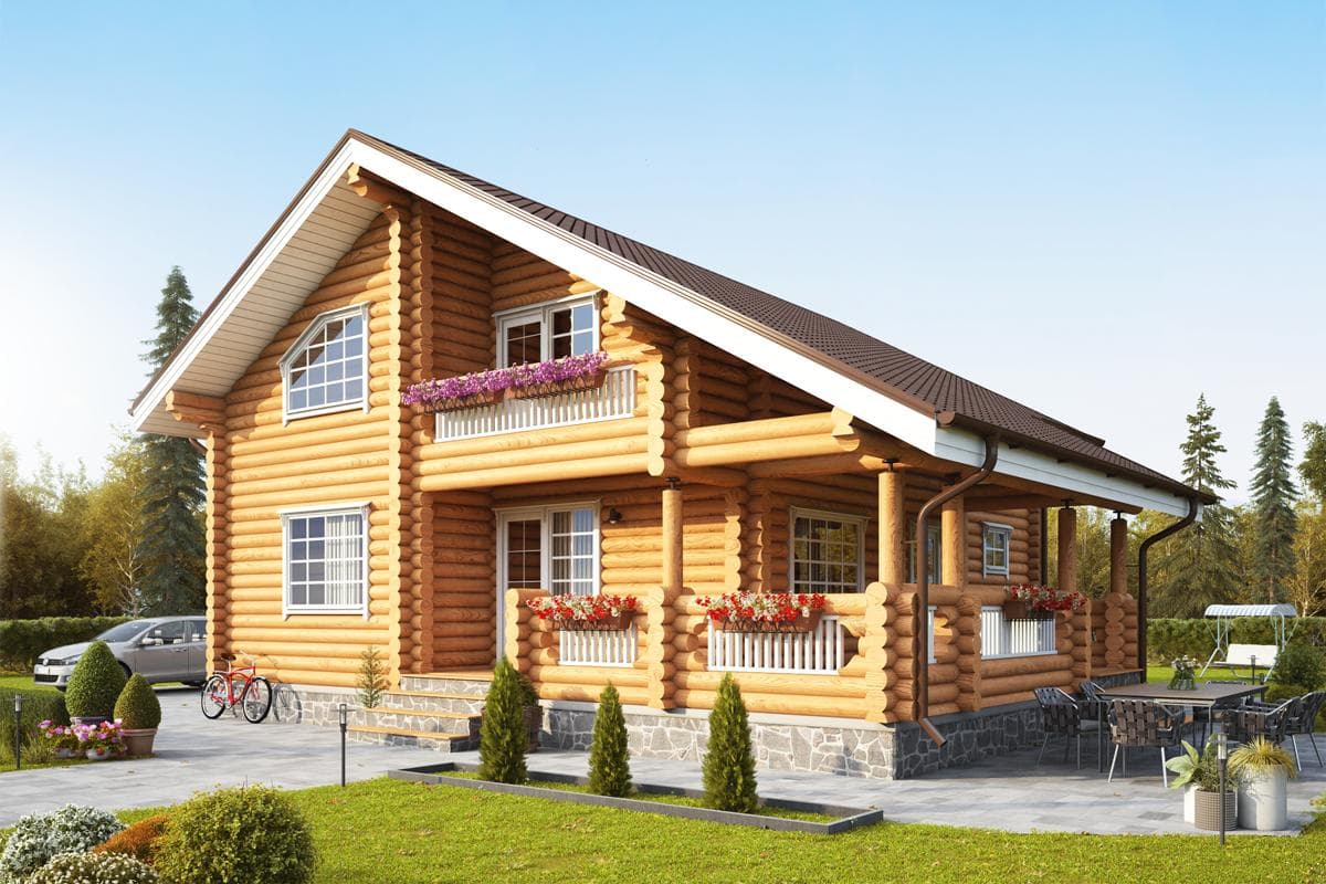 В стоимость входит: фундамент на железобетонных сваях, обвязка из бруса 200х200 мм, лаги пола 100х200 мм, стеновой комплект с монтажом из оцилиндрованного бревна диаметром 200 мм, крыша с покрытием из металлочерепицы