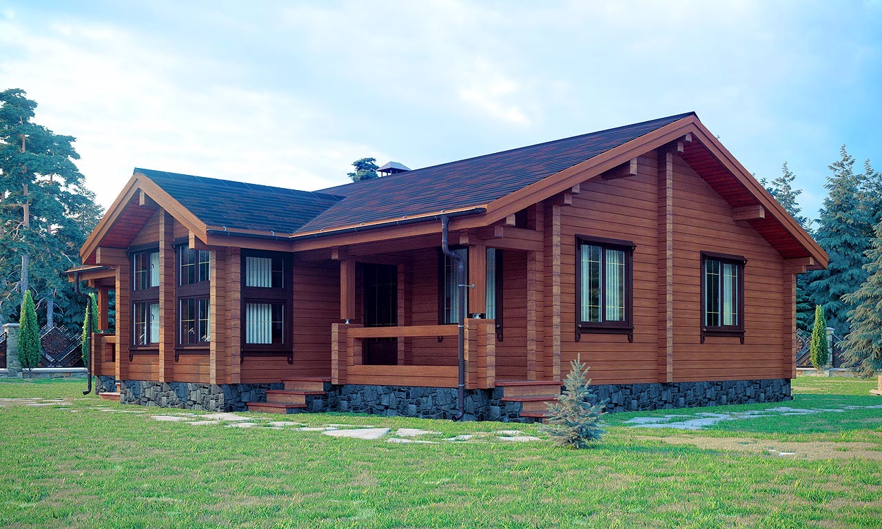 Просторный одноэтажный дом с красивой архитектурой по проекту «Ника» можно исполнить как из клееного бруса, так и из цельного профилированного бруса. Проектом предусмотрены две изолированные раздольные спальные комнаты и большая гостиная-кухня. Отдельно вынесена зона для собственной сауны с необходимыми вспомогательными помещениями: раздевалкой, душевой и санузлом.