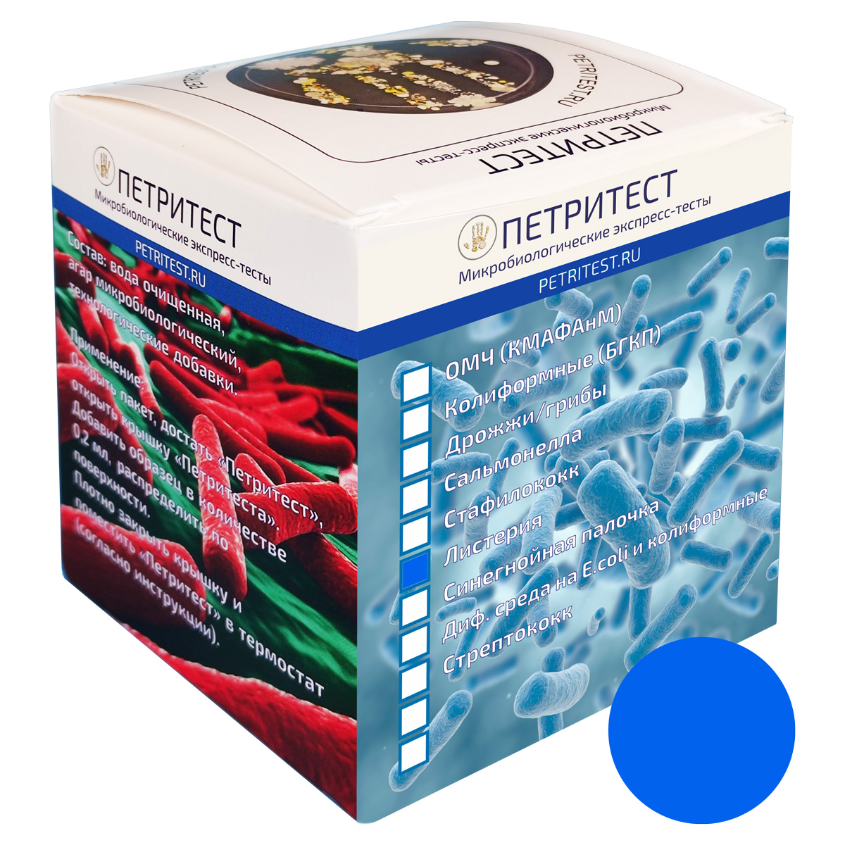 Готовый экспресс-тест для микробиологического анализа сырья, полуфабрикатов, готовых продуктов питания, окружающей среды и пр. Тщательный биоконтроль на предприятиях пищевой отрасли и в быту для определения микробиологической безопасности пищи, воды, жилого или рабочего пространства.