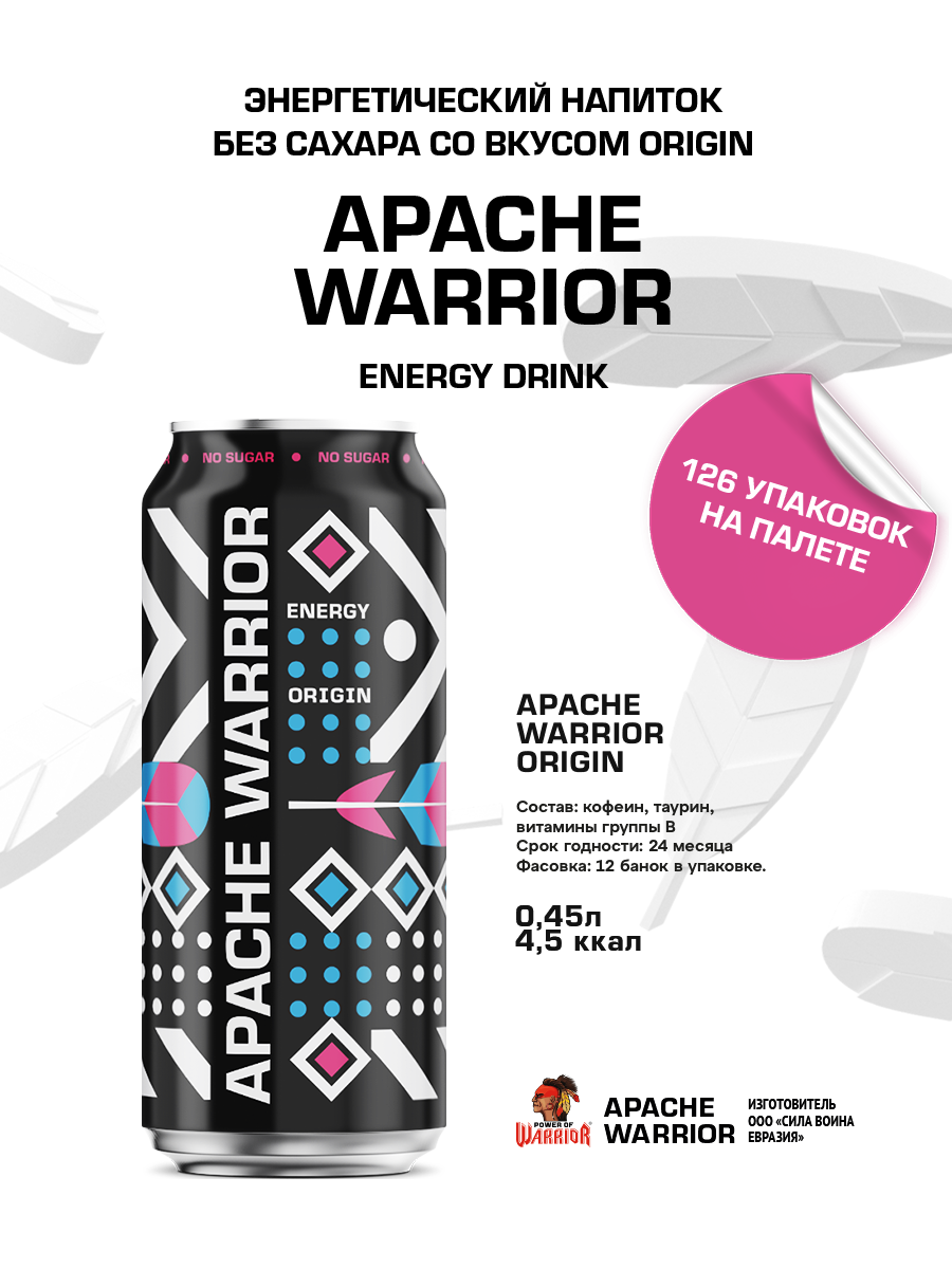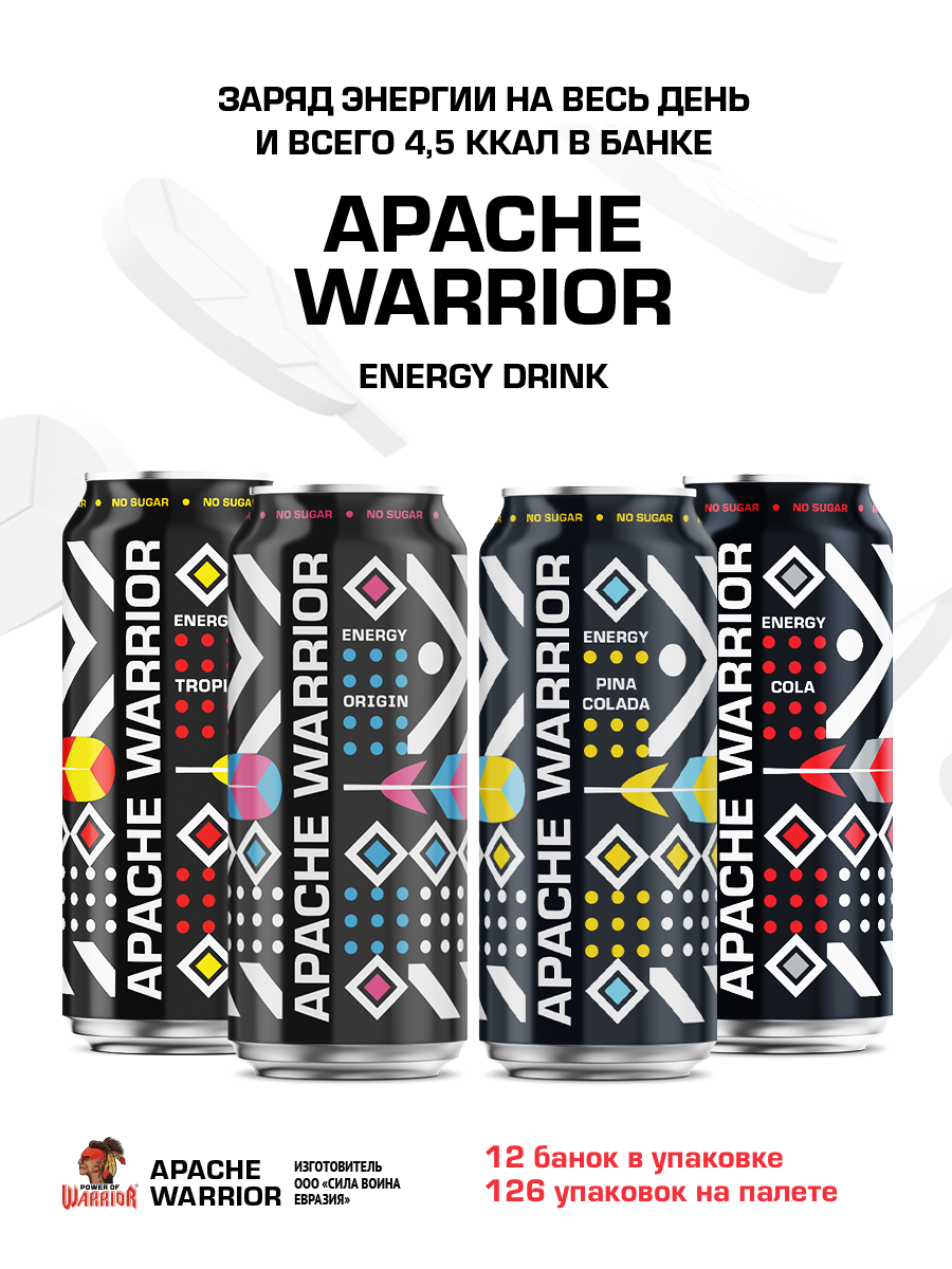 Завод-производитель предлагает энергетические напитки без сахара APACHE WARRIOR по лучшей цене. Напитки представлены в алюминиевой банке 0,45 л и включают в себя 4 вида: TROPIC (манго и цедра апельсина), ORIGIN (терпкий, кисло-сладкий вкус), COLA (классическая кола), PINA COLADA (ананас и кокос).