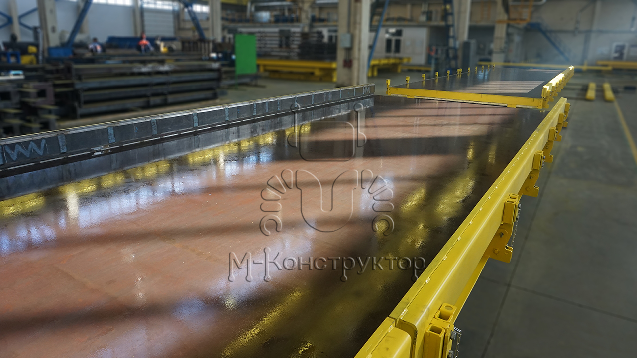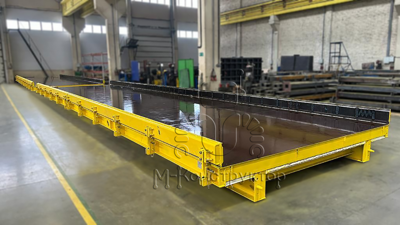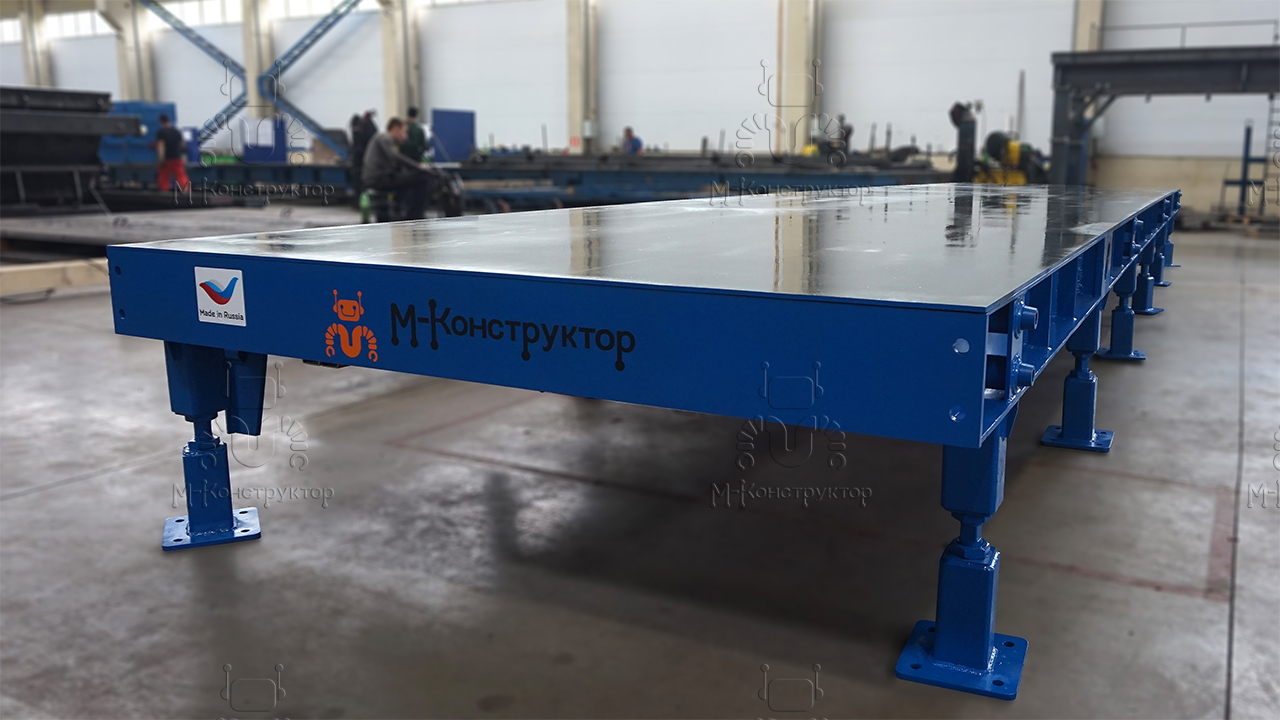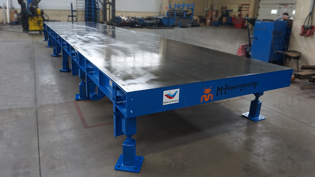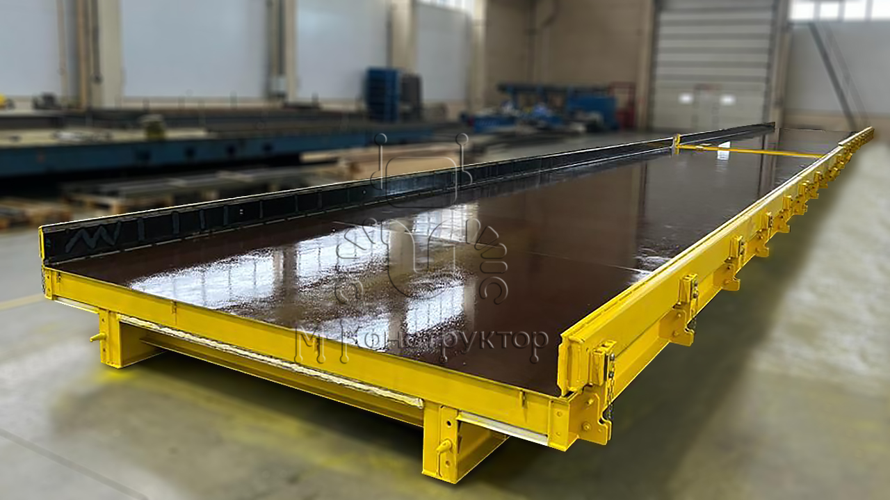 Универсальный формовочный стенд от "М-Конструктор" состоит из опорной рамы, которую устанавливают на бетонное основание, рабочей поверхности и системы отопления. Устройство оборудовано опорами, которые закрепляются на бетоне посредством регулируемых анкерных болтов. Сегменты формовочного стенда соединяются между собой шпильками, длина каждого сегмента — 10 метров, ширина от 3 до 4 м, масса 7450 кг, 1054 мм. Встроенные конусные центраторы в торцах рабочей поверхности исключают перепады по уровню совмещенных сегментов. Стенды могут быть оснащены сегментированными бортами, длина сегмента – 5-6 м. Высота бортов изменяется в диапазоне от 160 до 400 мм.