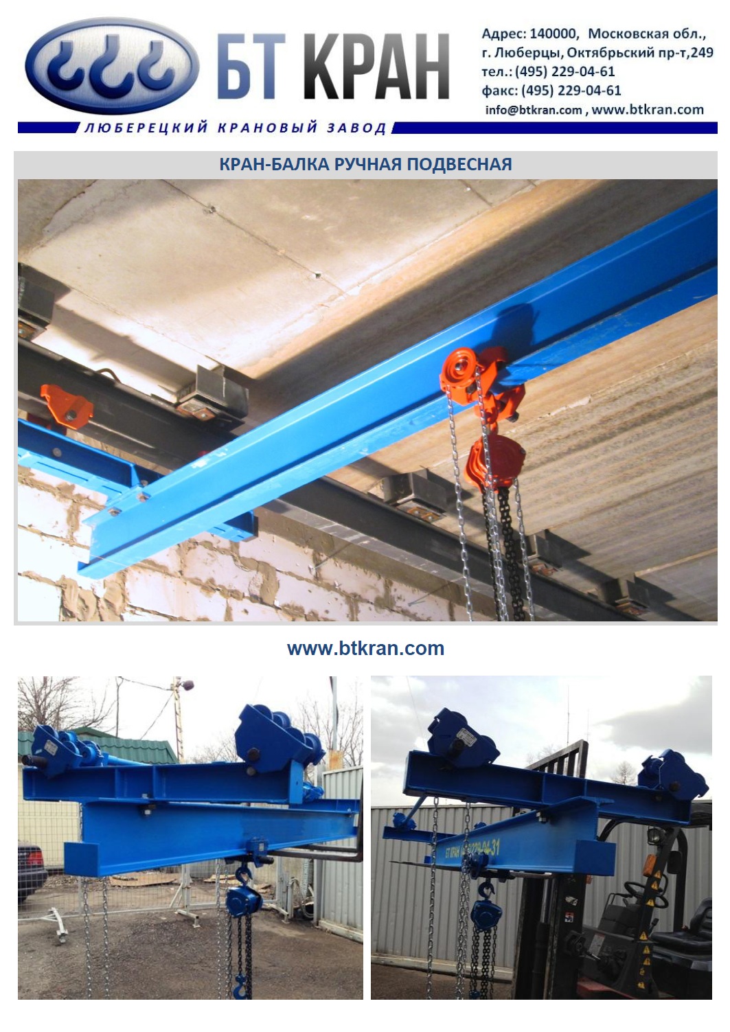 На кран однобалочный ручной опорный или подвесной, в качестве грузоподъемного механизма устанавливается таль (возможно применение ручной тали с холостой или приводной тележкой, а также электрический тельфер).