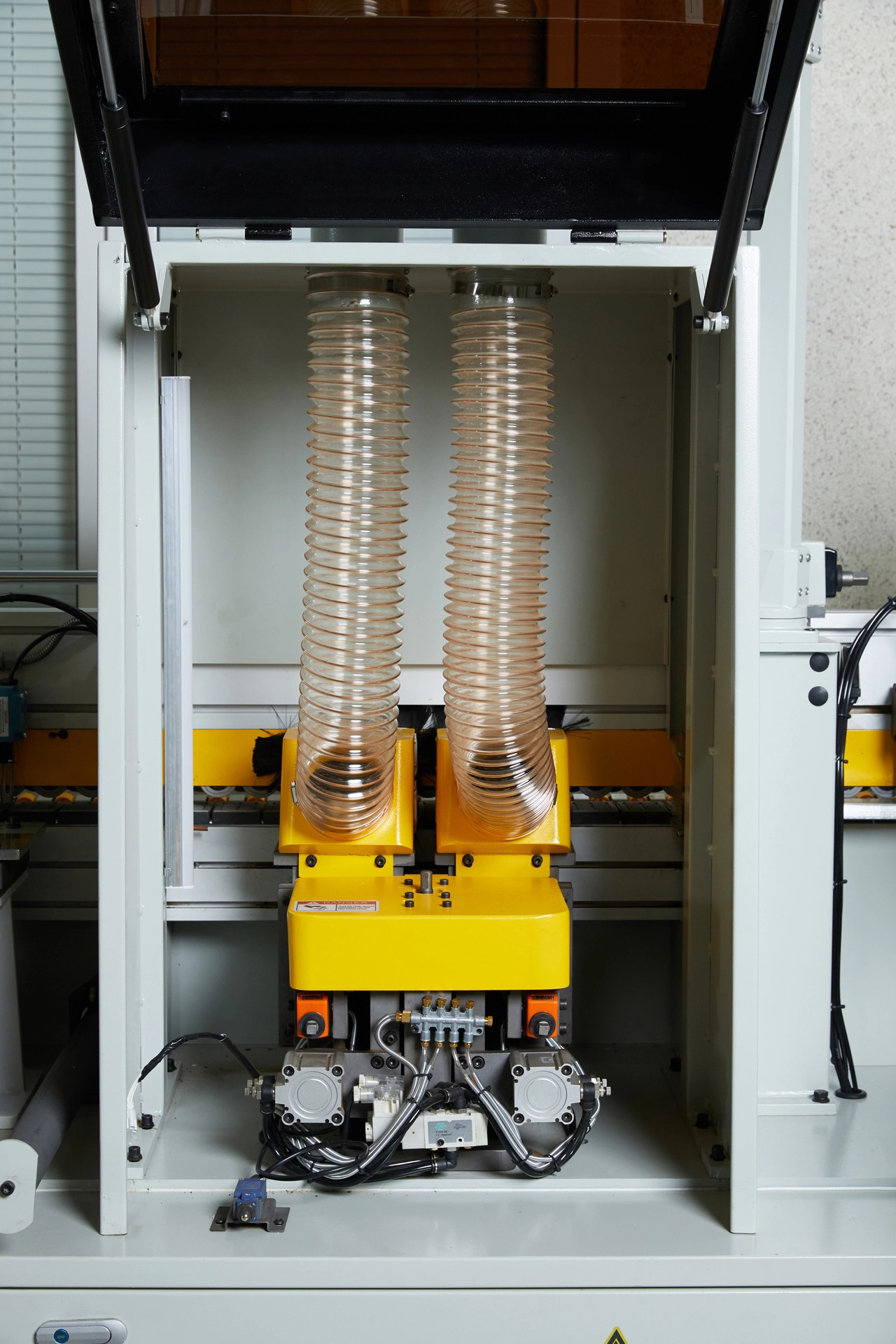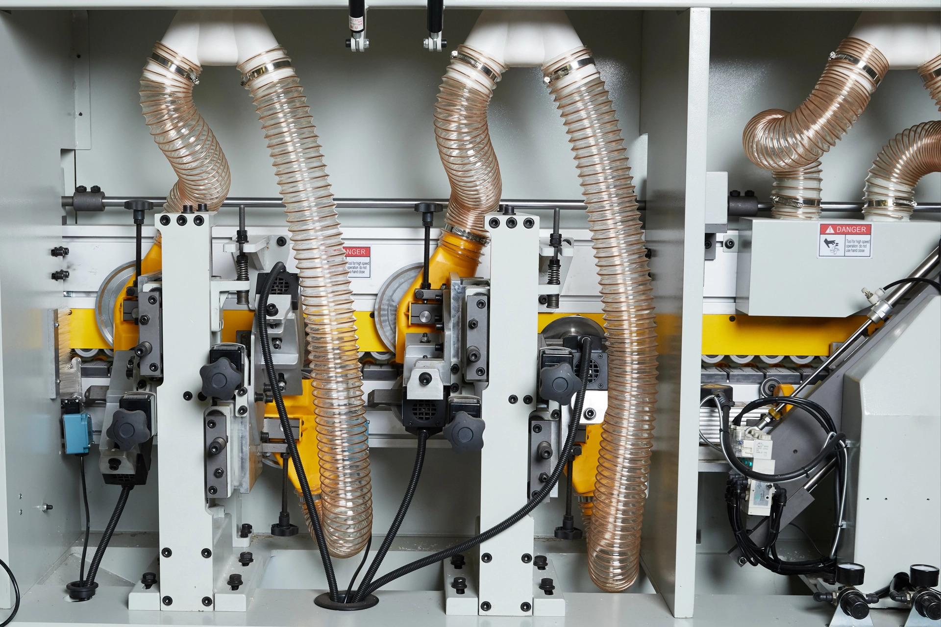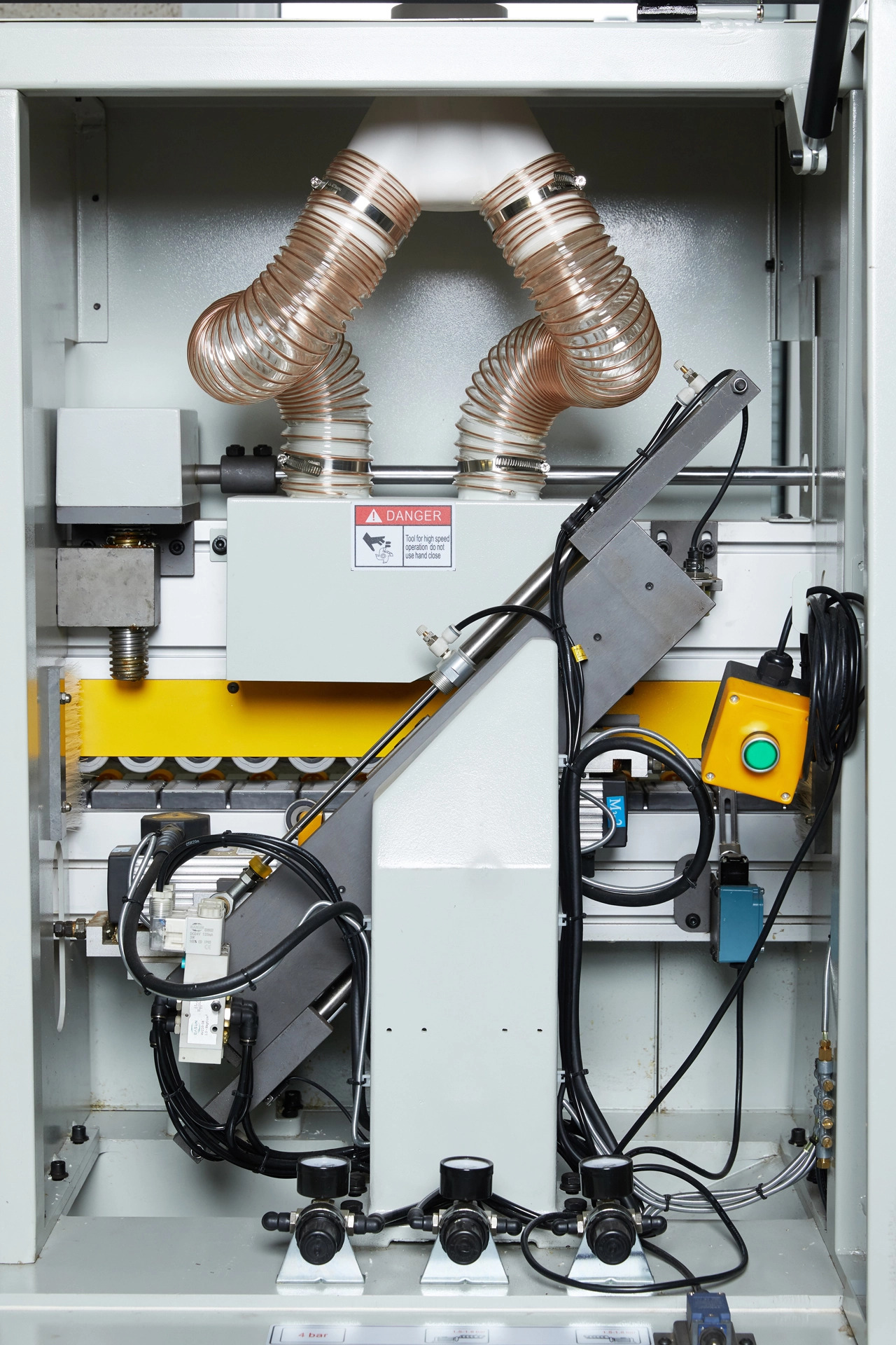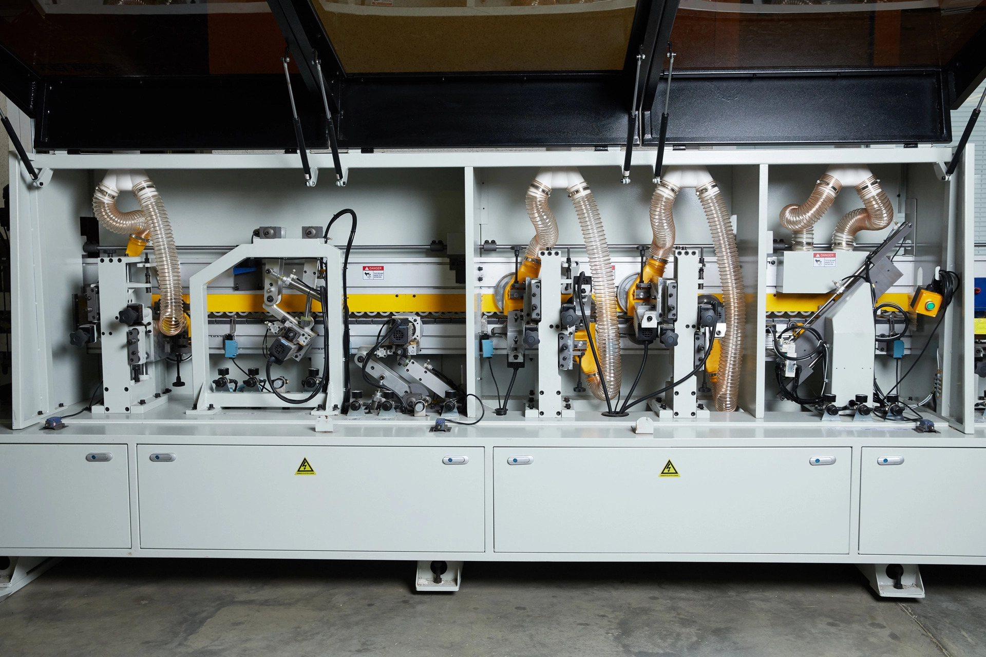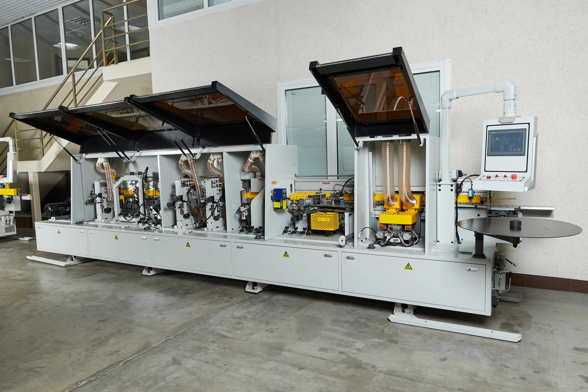 Переход с одного кромочного материала на другой происходит без переналадки станка. На станке в автоматическом режиме выполняется полный цикл операций по нанесению кромочного материала и его обработке:
