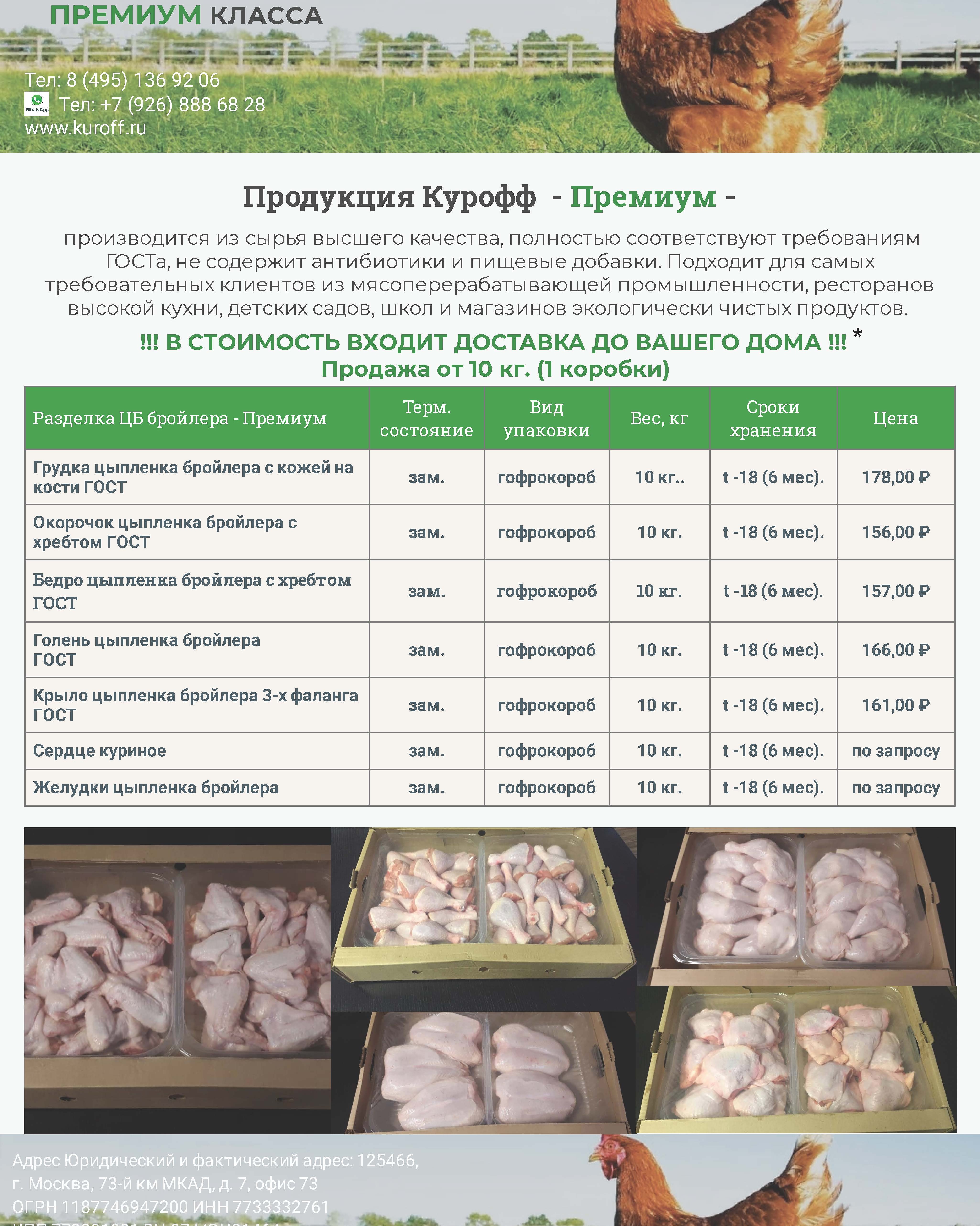 Компания "КУРОФФ" предлагает замороженное мясо курицы собственногопроизводства с бесплатной доставкой до вашего дома.