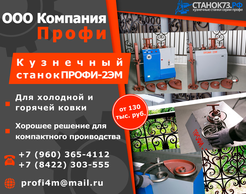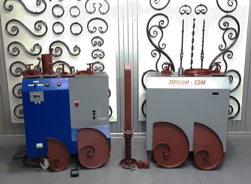 Кузнечные станки «Профи-2ЭМ», серийно выпускает и реализует торгово-производственная компания. Оборудование предназначено для изготовления по технологии «холодной и горячей» ковки из профильной трубы и полнотелого металлопроката декоративных элементов ковки, которые в дальнейшем и в определенной комбинации свариваются: в ограждения, ворота, решетки, козырьки, мебель и т.д.