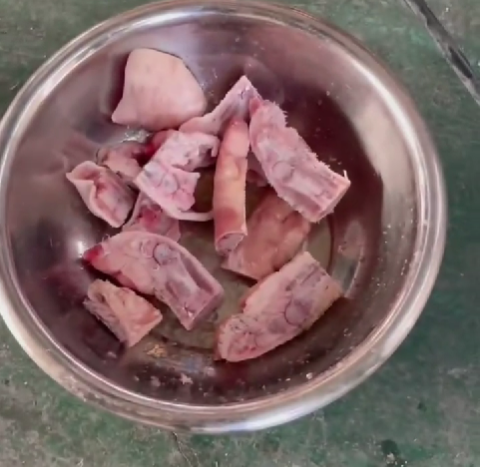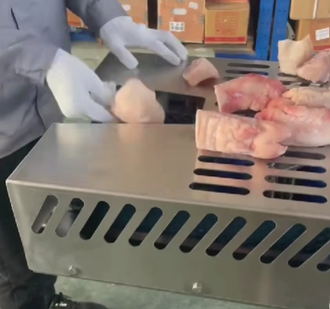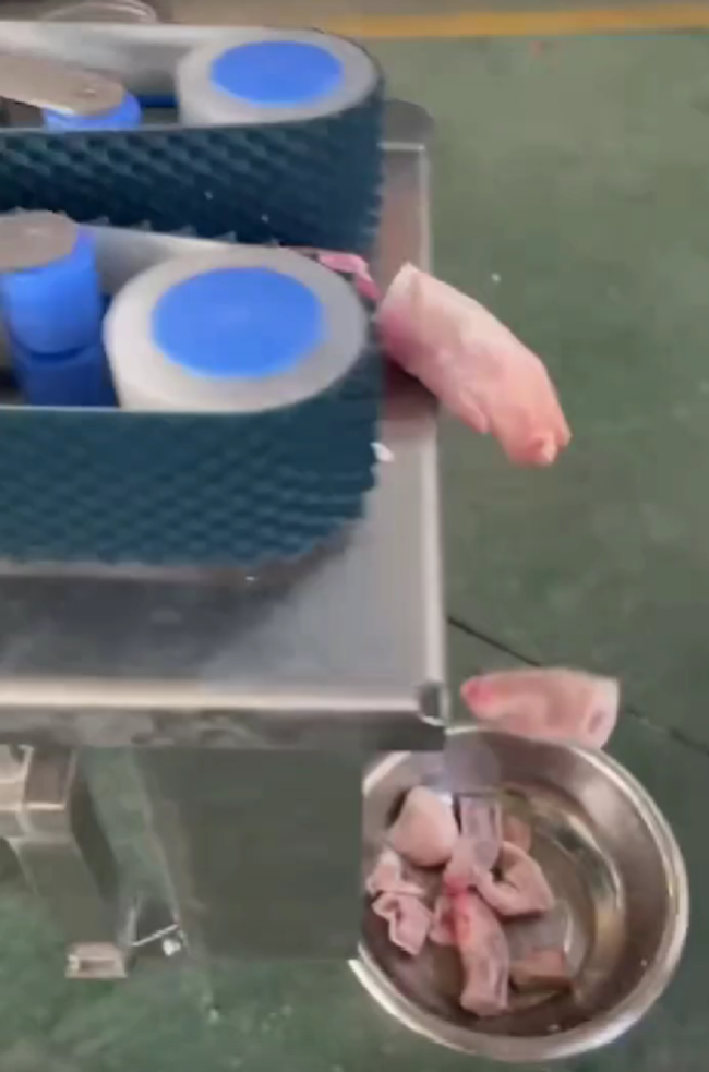 Оператор запускает машину и помещает исходный продукт в рабочую зону. Далее происходит нарезка продукта, после чего нарезанные свиные ноги падают в подготовленный контейнер.
