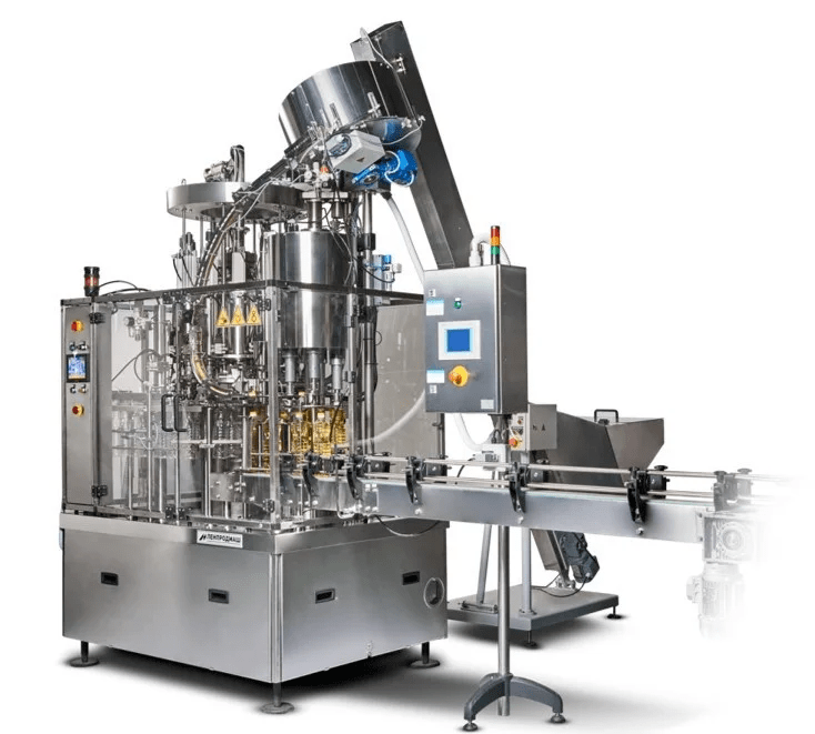 Машины для фасования и укупоривания уксуса (9%) по объему принудительным наливом (поршневое) в стеклянную тару 0,1-1,0 л производительностью до 3000 бут/ч.