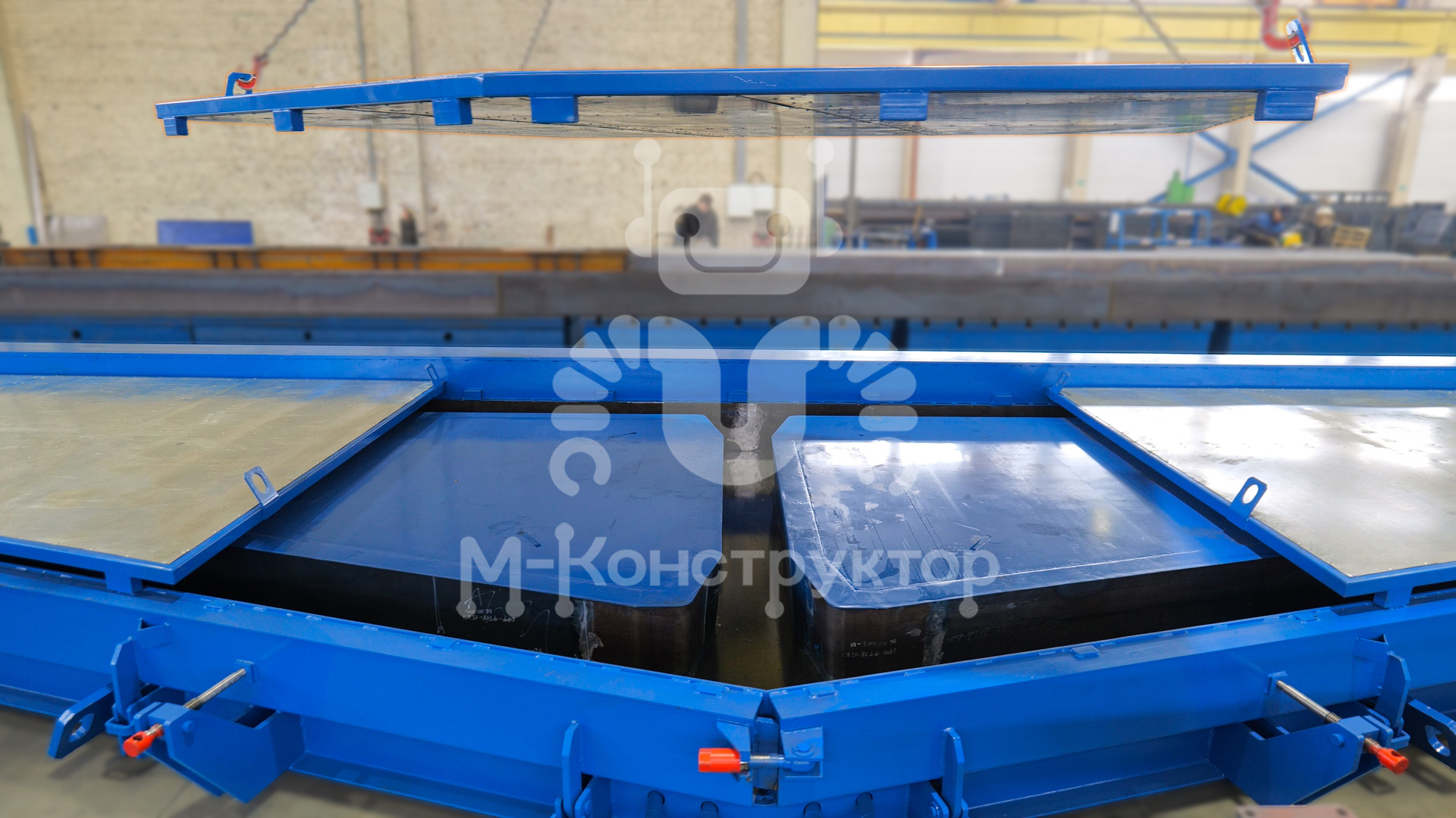 Продольные борта выполнены подвижными и откидываются при распалубке, что облегчает извлечение изделия. Проёмообразователи устанавливаются с точным позиционированием при помощи конусов, для демонтажа предусмотрены скрытые строповочные проушины.