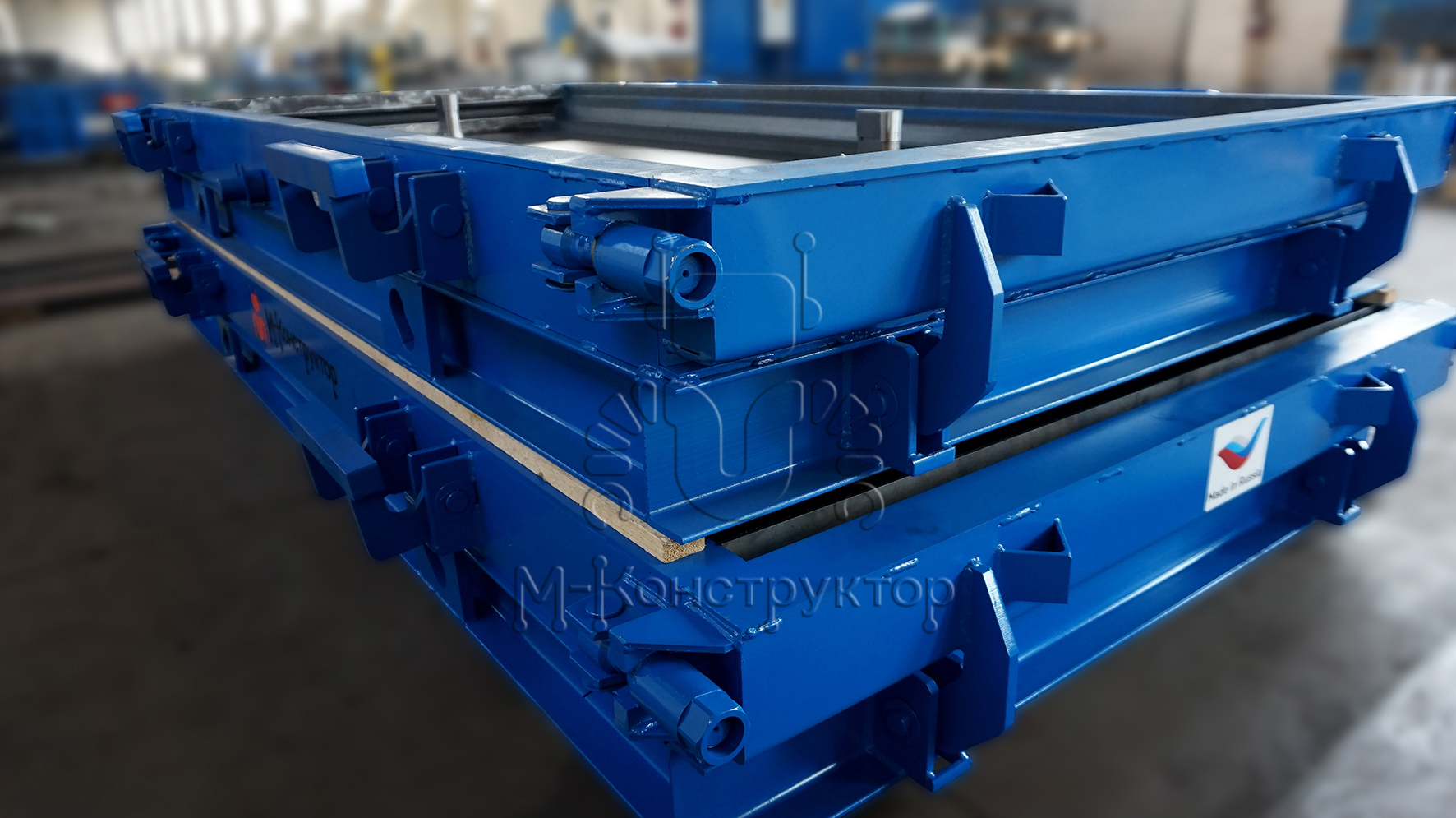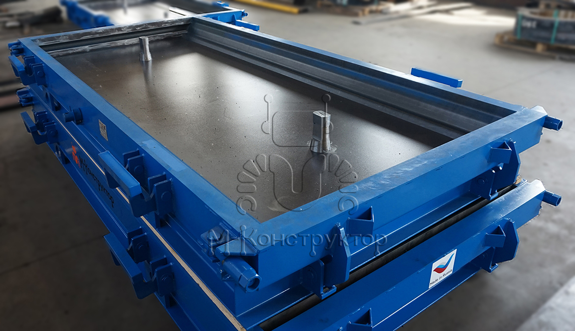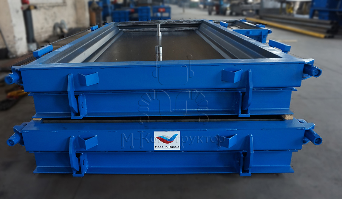 Металлоформы оборудованы откидными бортами, что облегчает распалубку. В замках на металлоформах производства "М-Конструктор" применяется гайка с внешним шестигранником для возможности применения пневмо- или электрошуруповерта. Это ускоряет процесс распалубки. Также в комплекте есть накидная головка с отверстиями под монтажку. По бортам металлоформы размещаются монтажные петли для удобства ее перемещения при эксплуатации.
