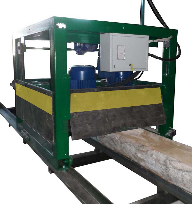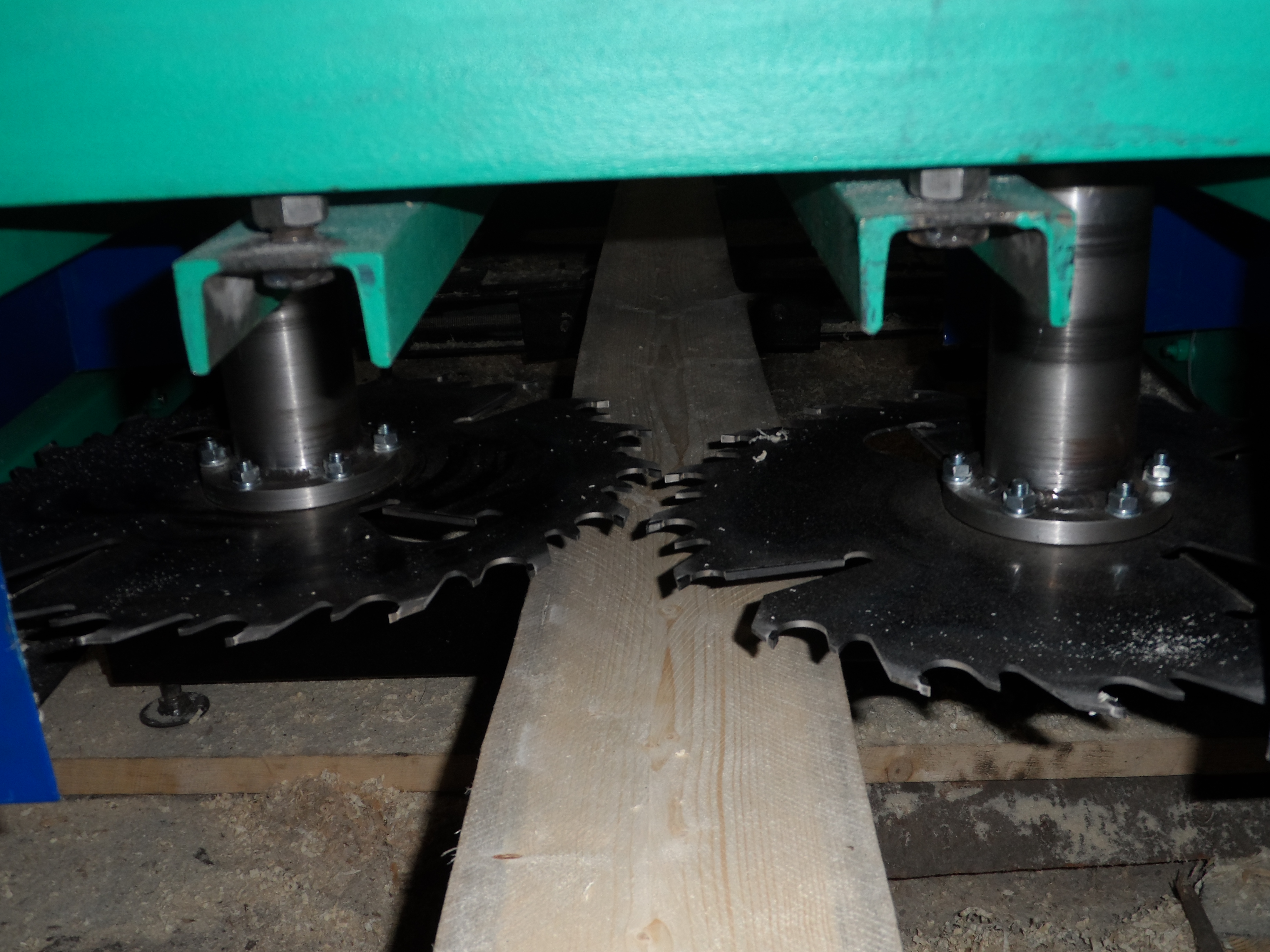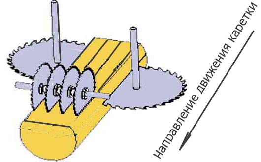 Одним из преимуществ комплекса «Серега» является его производительность, т.к за один проход можно получить несколько брусков и досок. Размер между вертикальными пилами выставляется вставками-разлучками. Сам пильный узел перемещается по винтовым направляющим.