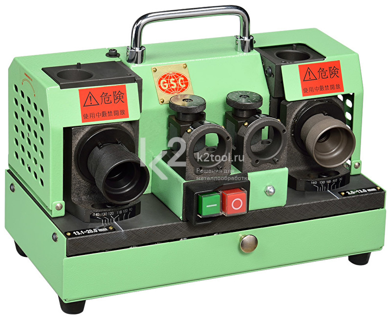 Данный станок состоит из 2-х частей. Слева можно затачивать свёрла диаметром от 2 мм до 13 мм, а справа – свёрла диаметром от 14 мм до 26 мм.