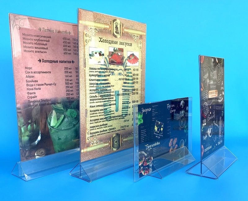 Основное преимущество настольных подставок для рекламных материалов — долговечность и доступная цена. Пластик легко обрабатывается антисептическими составами или просто водой не оставляя разводов. Толщина таблички 1 мм, что обеспечивает прочность и долговечность конструкции. Прозрачность материала обеспечивает полный обзор демонстрируемой информации.