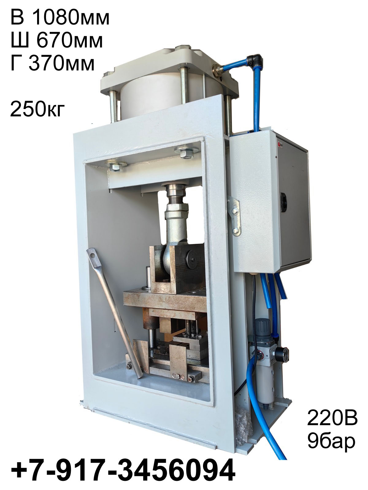 Полноценный двухоперационный штамп на колонках, вся пневматика Camozzi (Италия). Компактные размеры и питание от бытовой сети 220В позволяют разместить производство на ограниченной площади. Управление через ножную педаль, что освобождает оператору обе руки для работы.