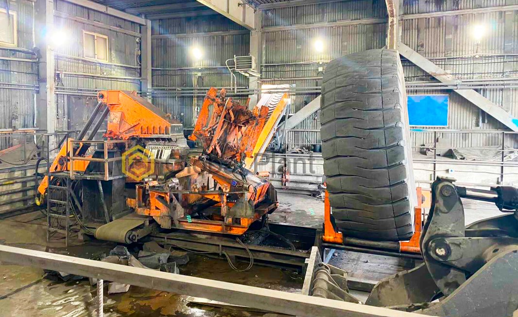 Разрезает покрышки на отдельные фрагменты от R22,5 до R57, весом от 20 до 50 килограммов.