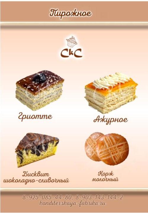 Предлагаем вашему вниманию каталог пирожных собственного производства: пирожные «Корзиночка с творожным кремом», «Сметанник», «Пенёк», «Корзиночка со сгущенным молоком», «Лимонное», кольцо с творогом, «Буше», «Мокко», «Песочная полоска», «Гриотте», шоколадно-сливочный бисквит, молочный корж, заварная трубочка, кольцо с арахисом, мраморный бисквит.