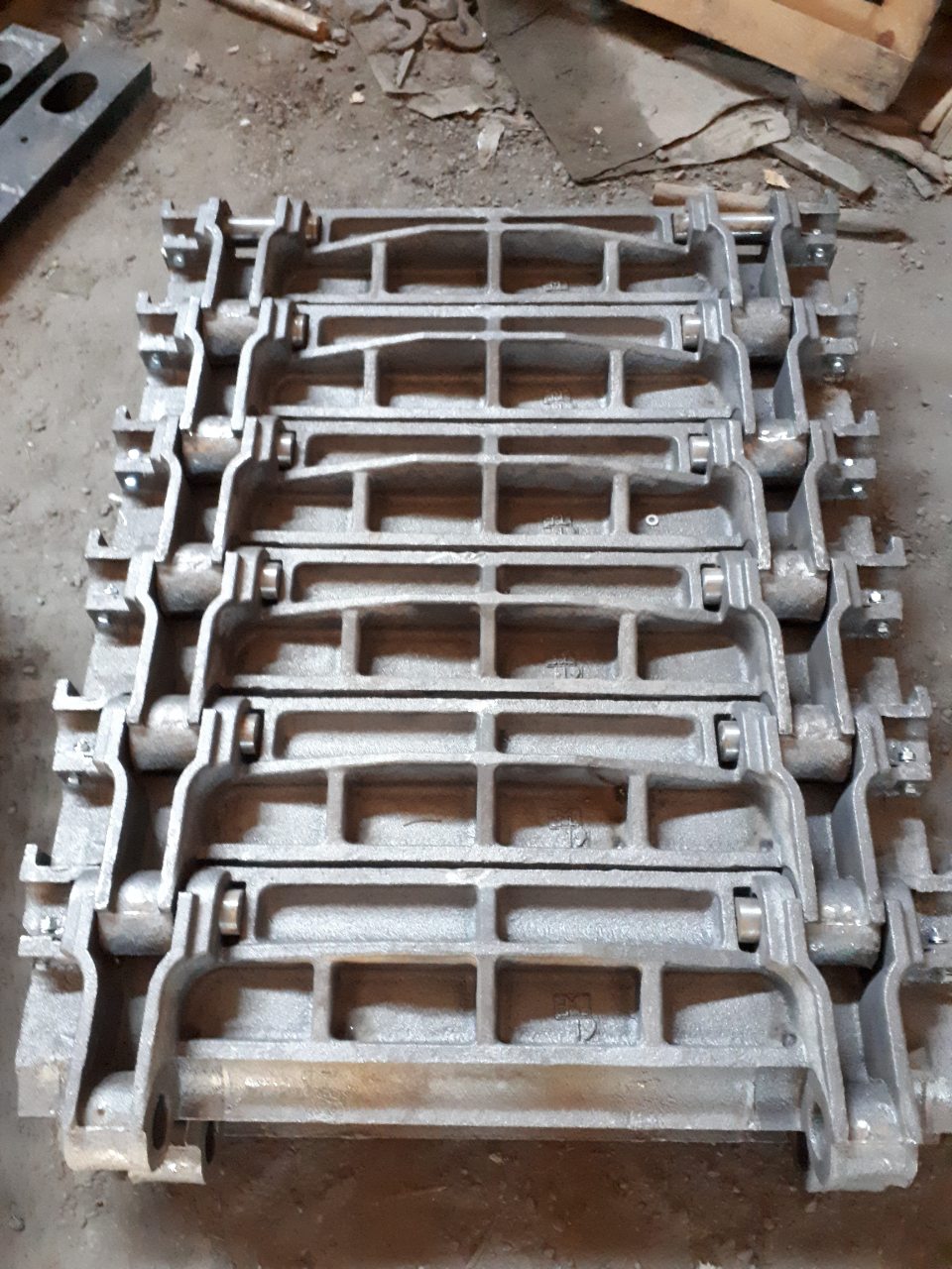 Данные пластины изготавливаются с использованием современных технологий машинной формовки и машинной заливки, а также с использованием экзотермических вставок, что позволяет получить более износостойкое изделие с улучшенной структурой металла. При изготовлении данных пластин используются современные стержневые ящики немецкого производства, что позволяет проливать точные отверстия на «ушках» пластины для исключения лишних колебаний при работе питателя и снижения износа пластин.