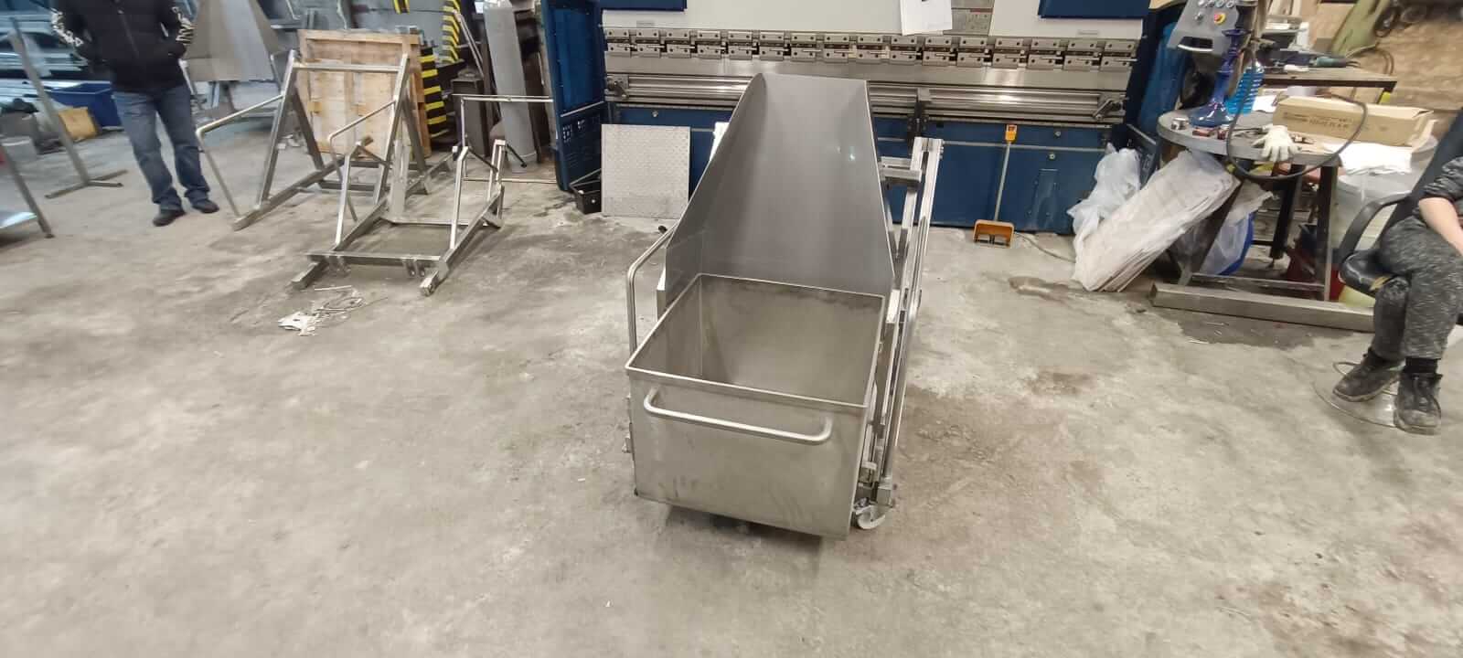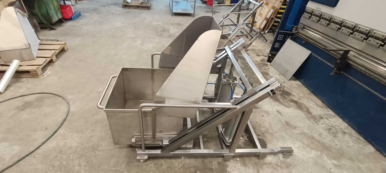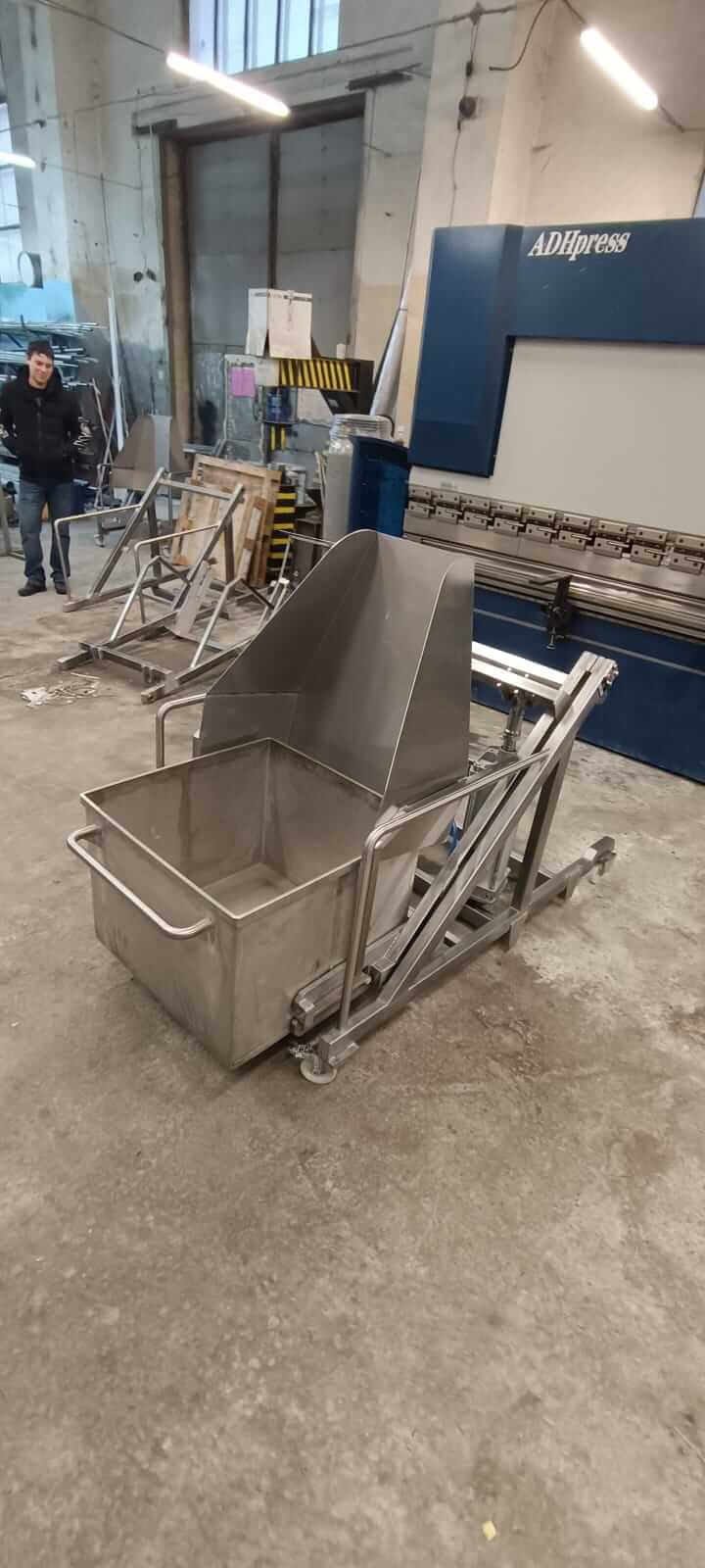 Контейнер или тележка с сырьем вкатывается в захват и фиксируется, ее подъем и переворот выполняется с помощью поршня, по выполнению она освобождается нажатием на педаль.