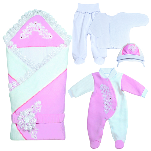 Комплектация наборов для новорожденных от 2-х предметов и более: лента на выписку, банты нарядные, распашонки, ползунки, пеленки, комбинезон, купание, чепчики.