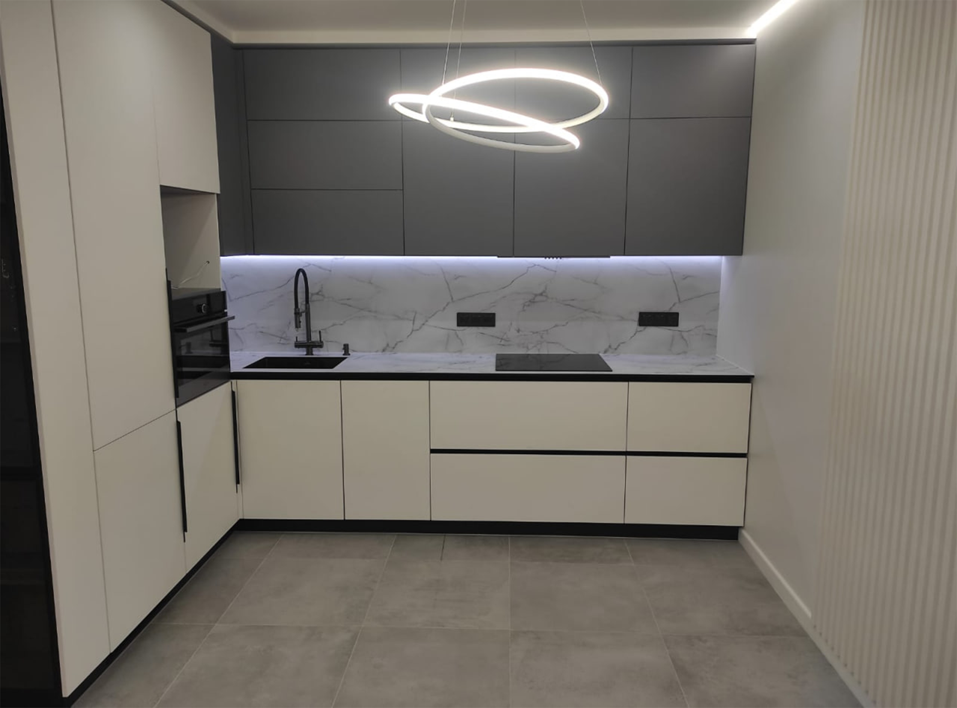 Прямая столешница и стеновая панель на кухню в один цвет из hpl компакт пластика под камень Arcobaleno жемчужный перито под ключ