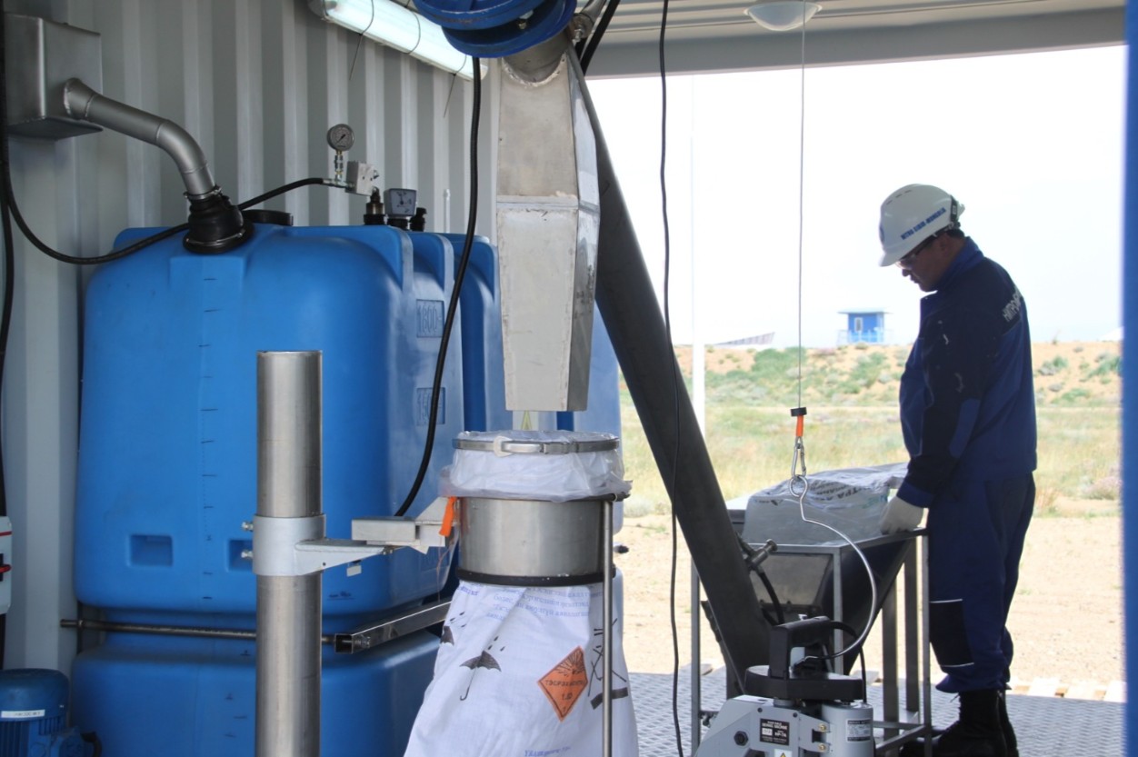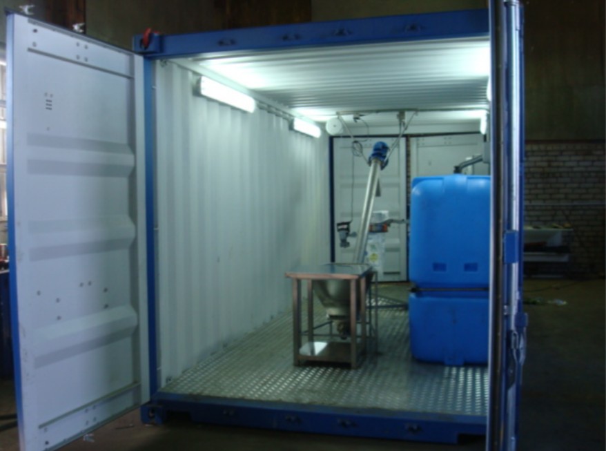 Внутри блок-модуля - установлен смеситель УПГ-1000. Над приемным бункером смесителя УПГ - в полотке, организован двустворчатый распашной люк - для подачи в бункер смесителя УПГ мягких контейнеров МКР (габаритами до МКР-1000) с гранулированной селитрой.