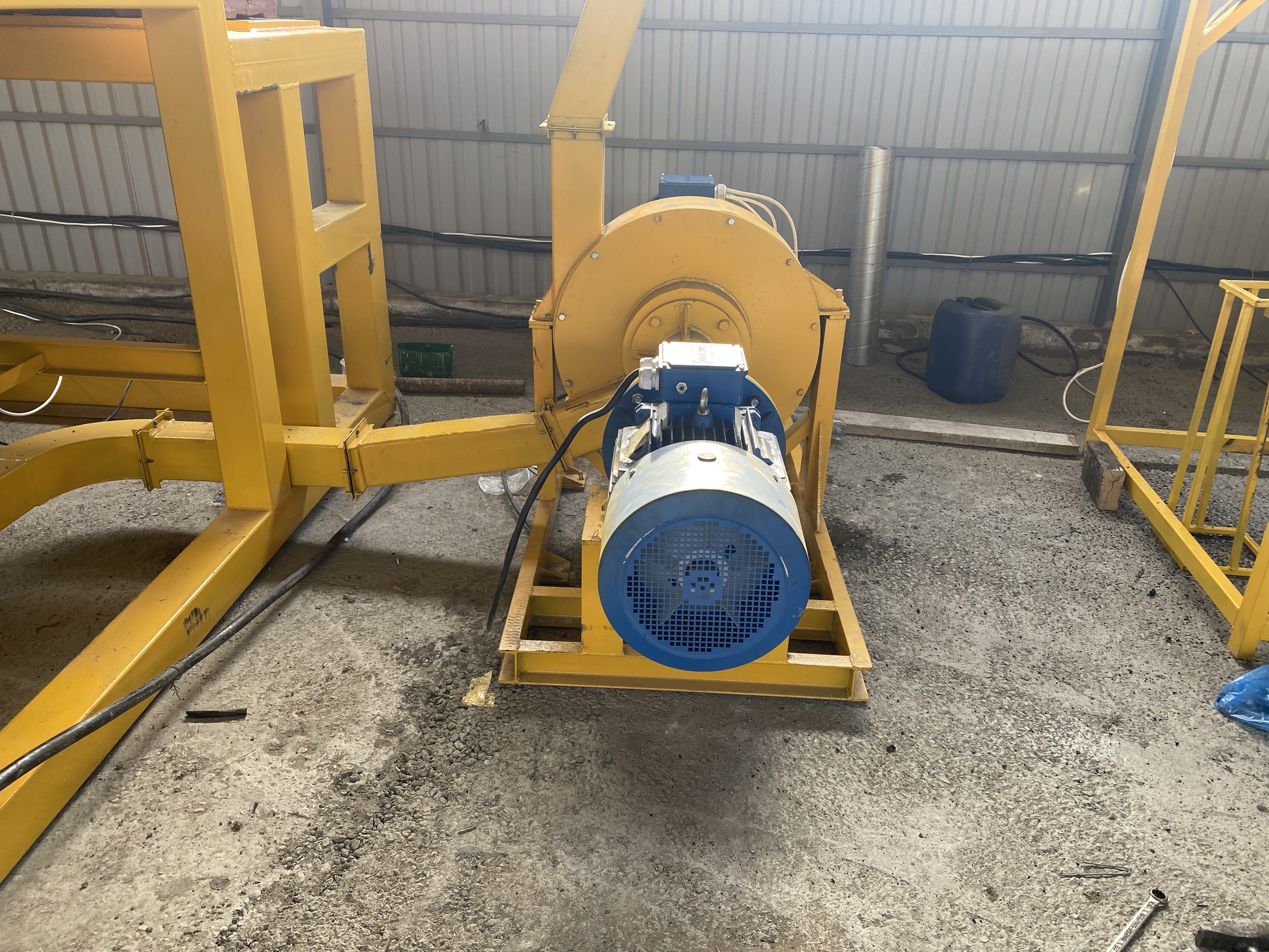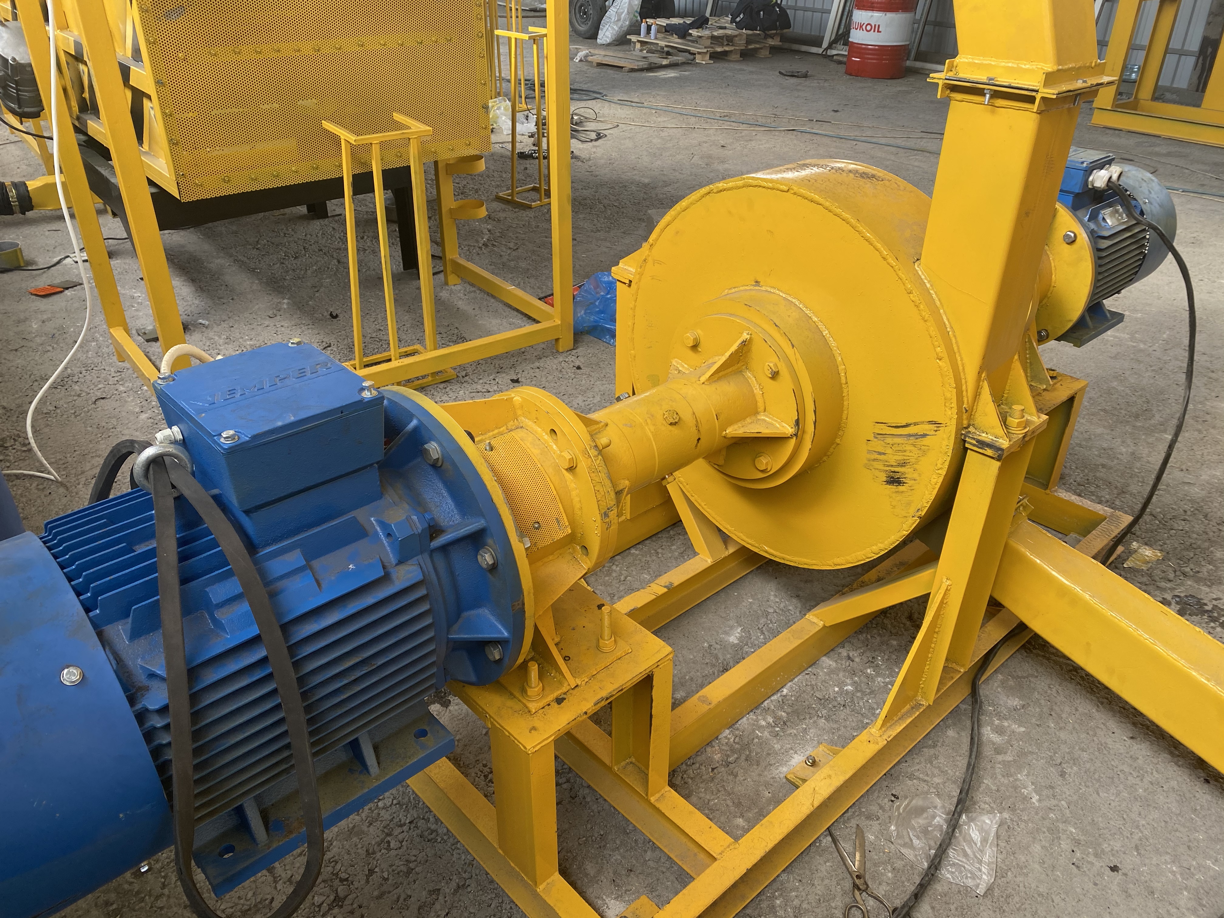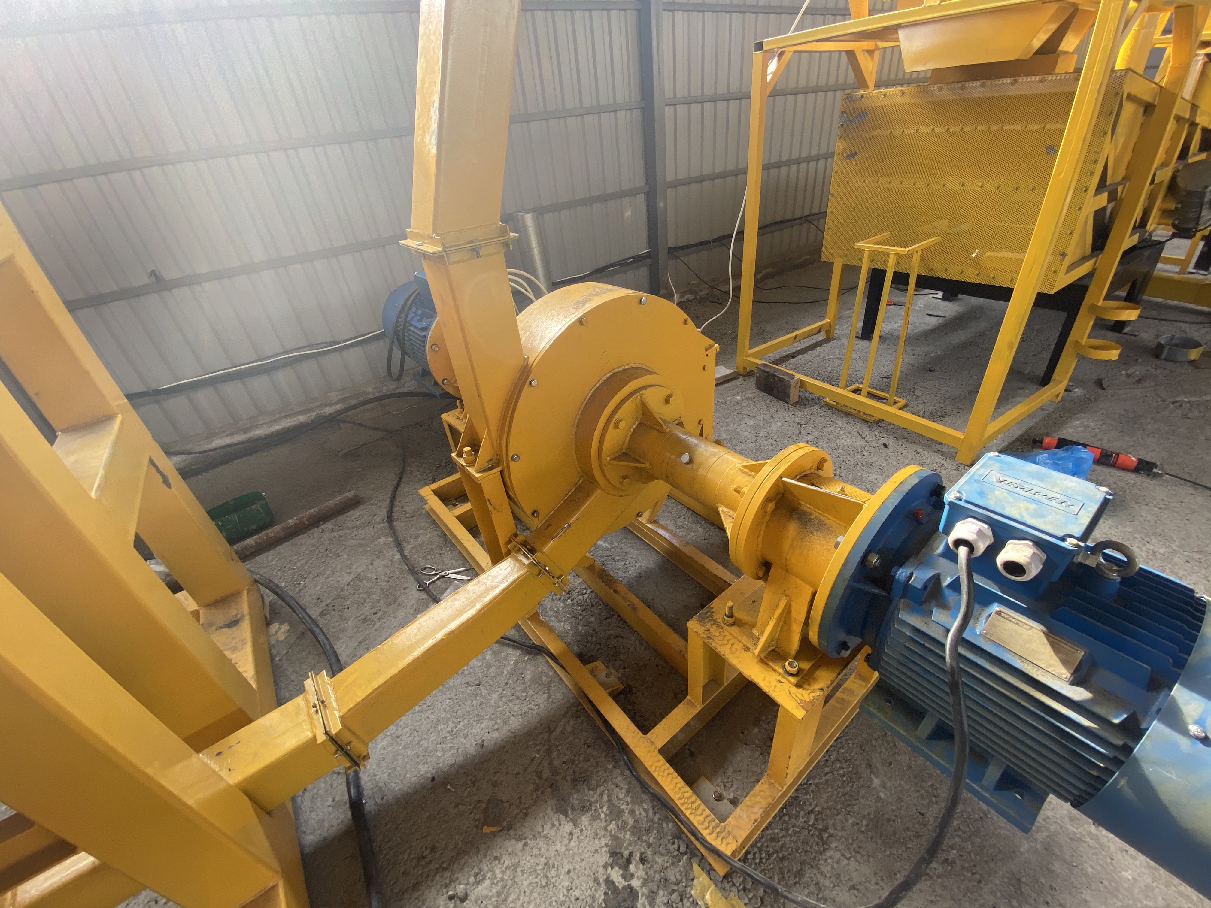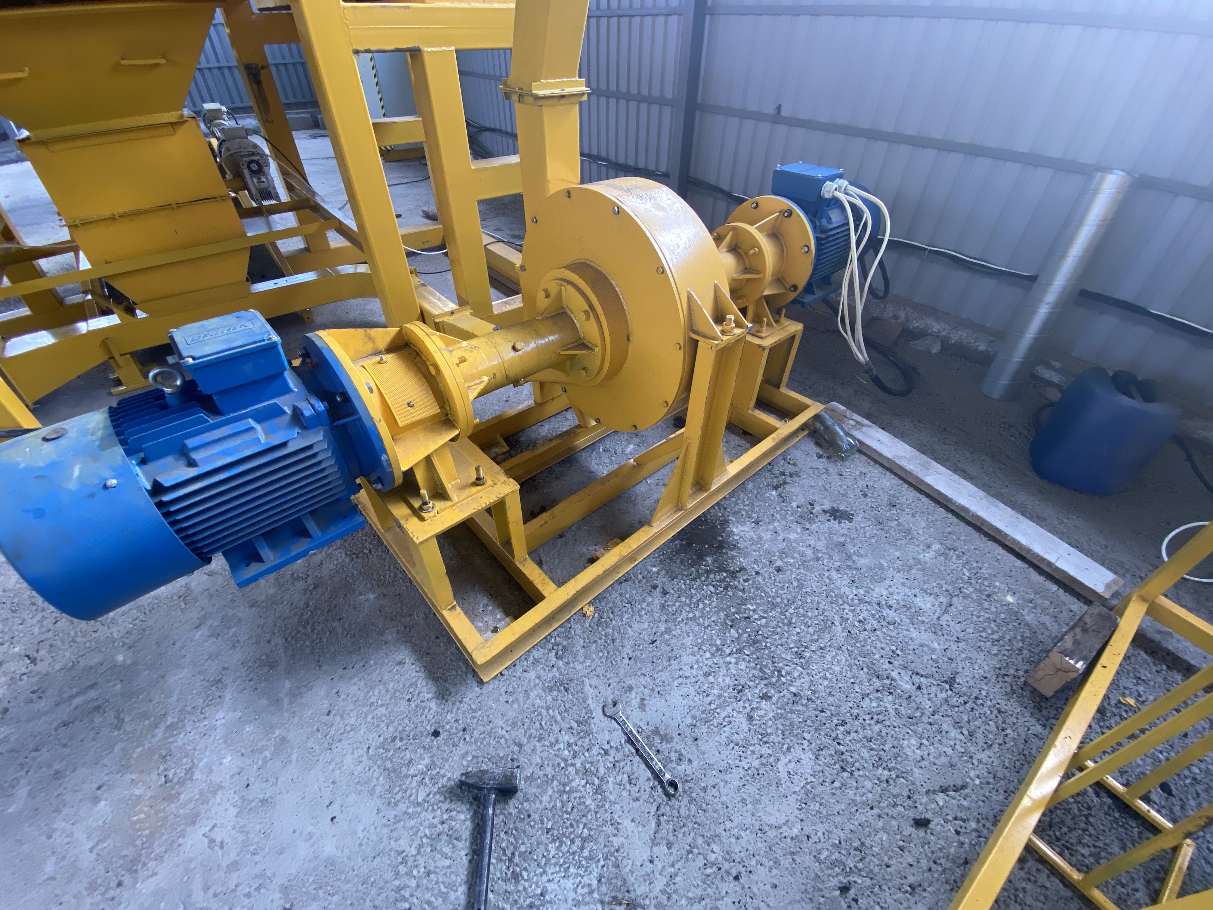 Измельчение происходит путем вращения внутреннего и внешнего ротора внутри барабана, вращение осуществляемое внутренним и внешнем ротором на встречу друг другу образуют воздушный поток, который втягивает резиновые чипсы в барабан дробилки.