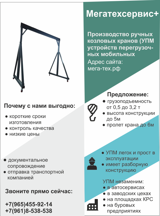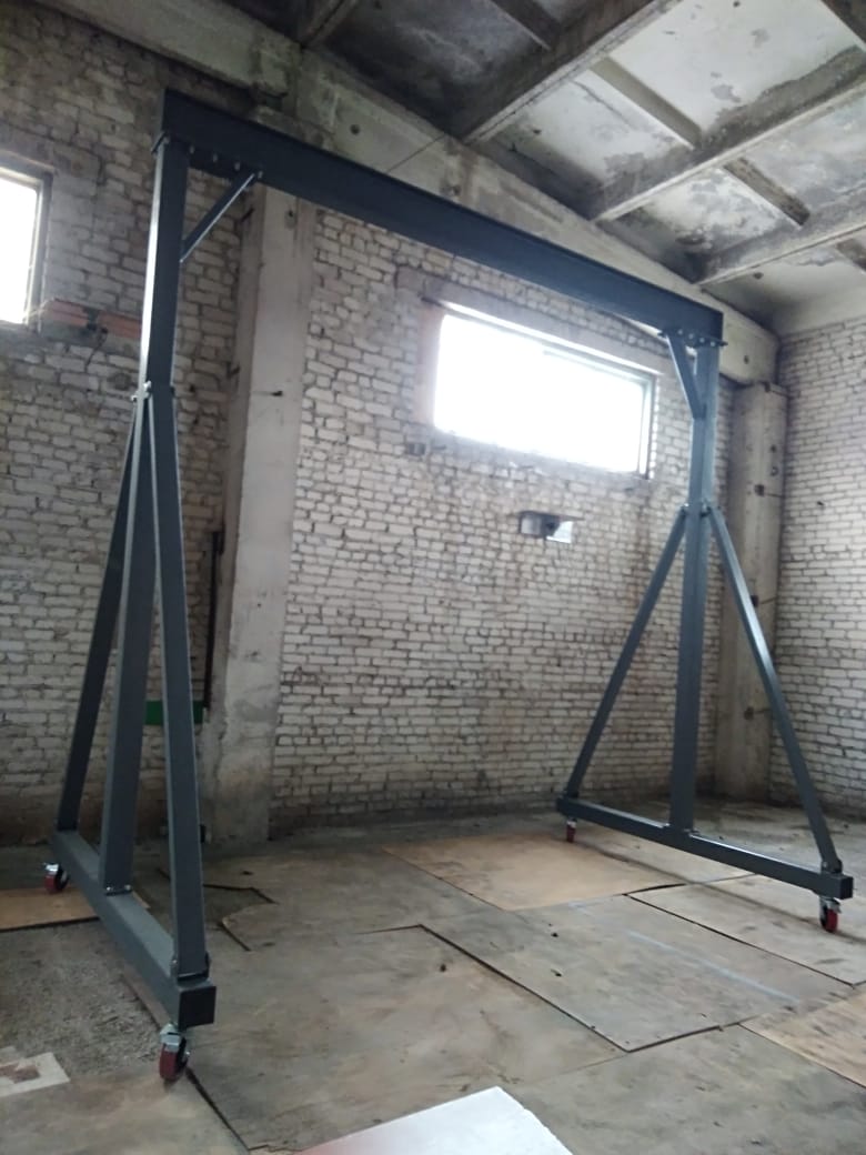 Состоит из балки пролетной, балок опорных, стоек, укосин, колес поворотных (из них - два с тормозом), которые крепятся между собой стандартными крепежными изделиями. Колеса полиуретановые. Пролетная балка служит для навешивания тали.