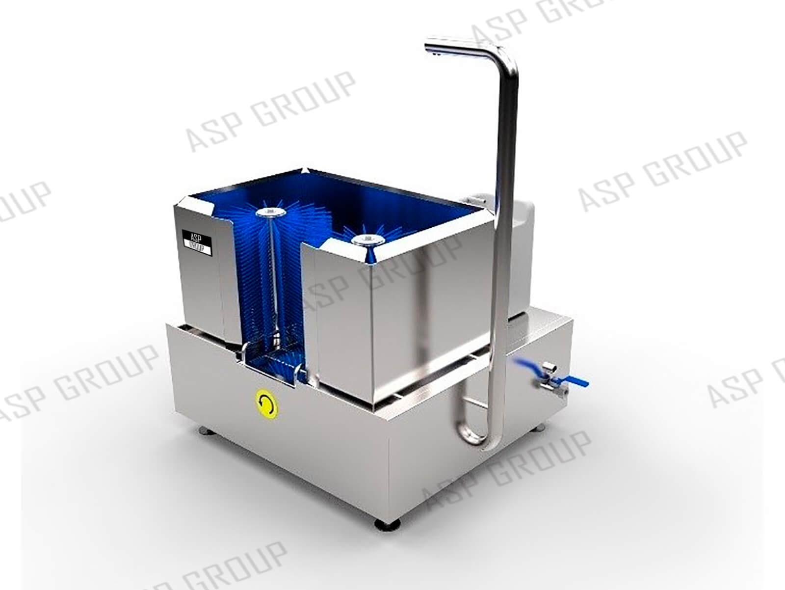 Модуль чистки подошв и голенищ обуви. Оснащен одной горизонтальной и двумя вертикальными щетками, вращающимися вовнутрь, предотвращая разбрызгивание моющего раствора. Раствор подается под давлением при помощи форсунок, расположенных по периметру ванны. Щетки приводятся в движение мотор-редукторами. Для нижней (горизонтальной) щетки предусмотрена специальная решетка. Вращение щеток и подача моющего раствора активируются кнопкой, установленной на поручне.