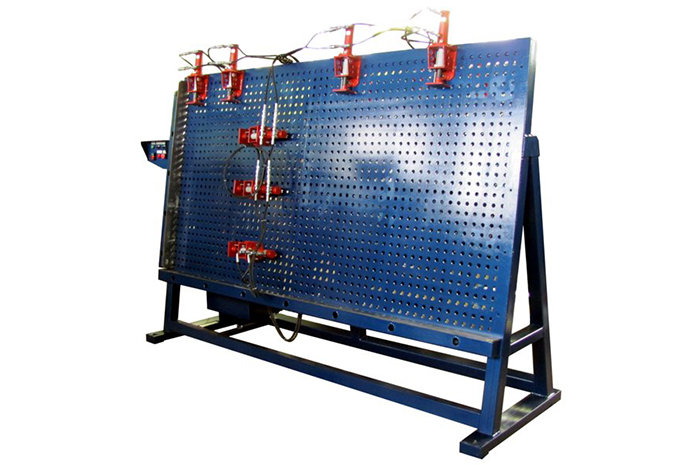 Рабочая область ваймы представляет собой металлическую пластину с нанесенными на нее координатными отверстиями, отдаленными друг от друга на 50мм. Такая конструкция позволяет работать с заготовками любых геометрических размеров, не превышающих максимальные габариты устройства. На каждой из координатных точек заготовку надежно будет удерживать пресс, ход поршня которого 75 мм.