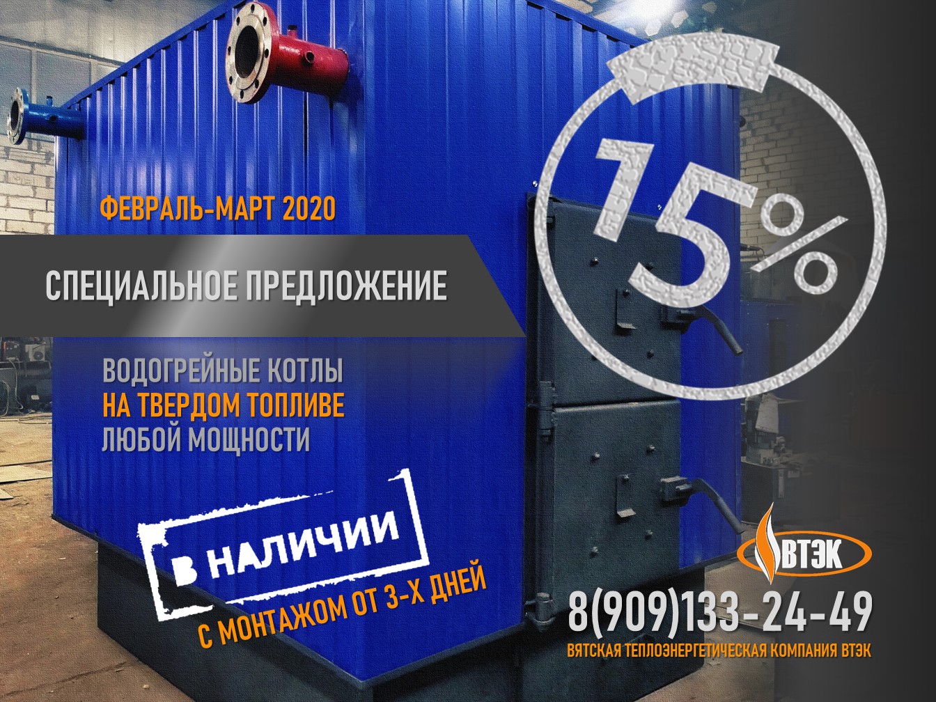Специальное предложение на все водогрейные котлы КВр и КВм на твердом топливе любой мощности с февраля по март 2020 года. Промышленные водогрейные котлы КВр и КВм на твердом топливе в НАЛИЧИИ с МОНТАЖОМ от 3 дней со СКИДКОЙ 15%.