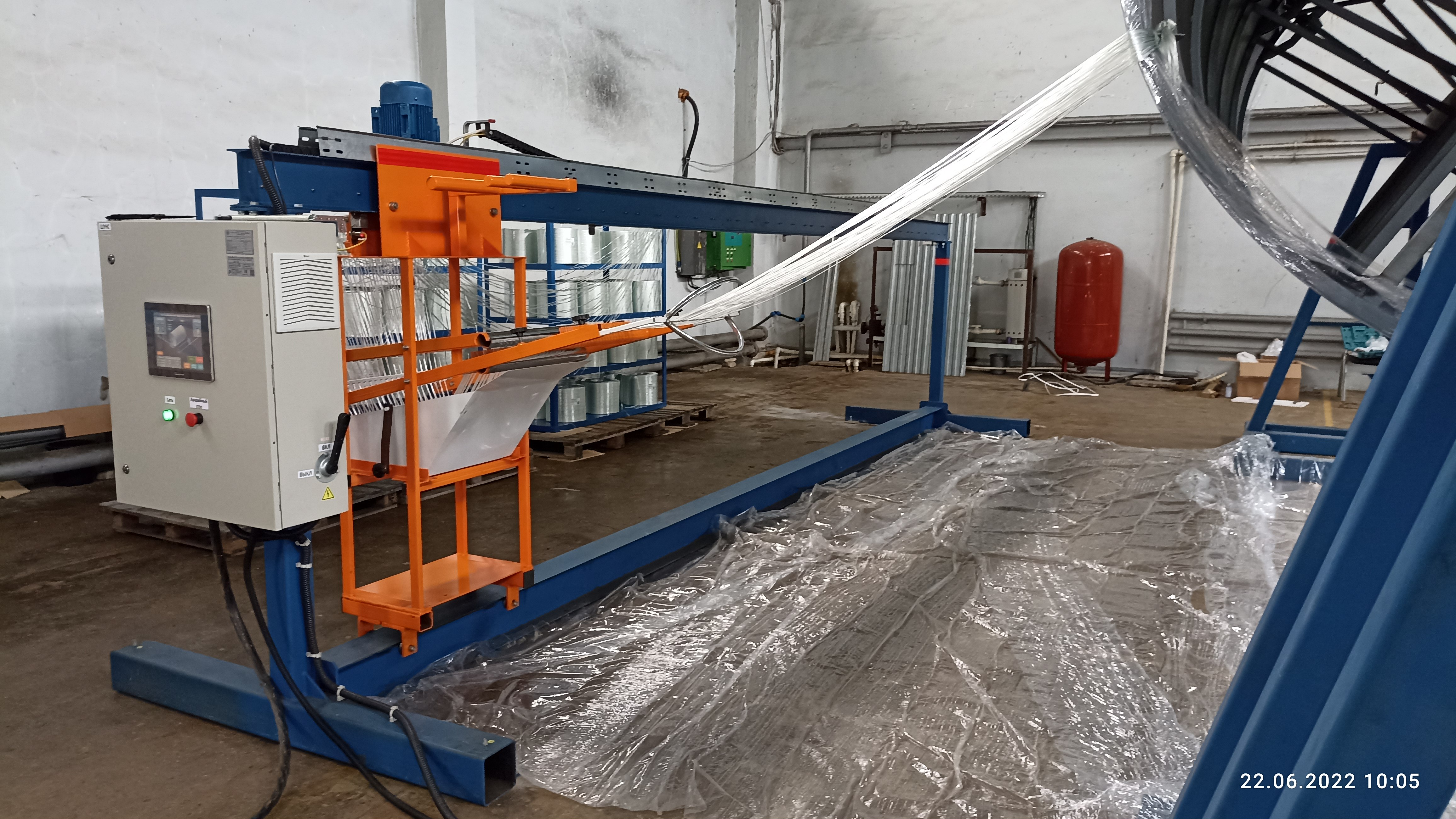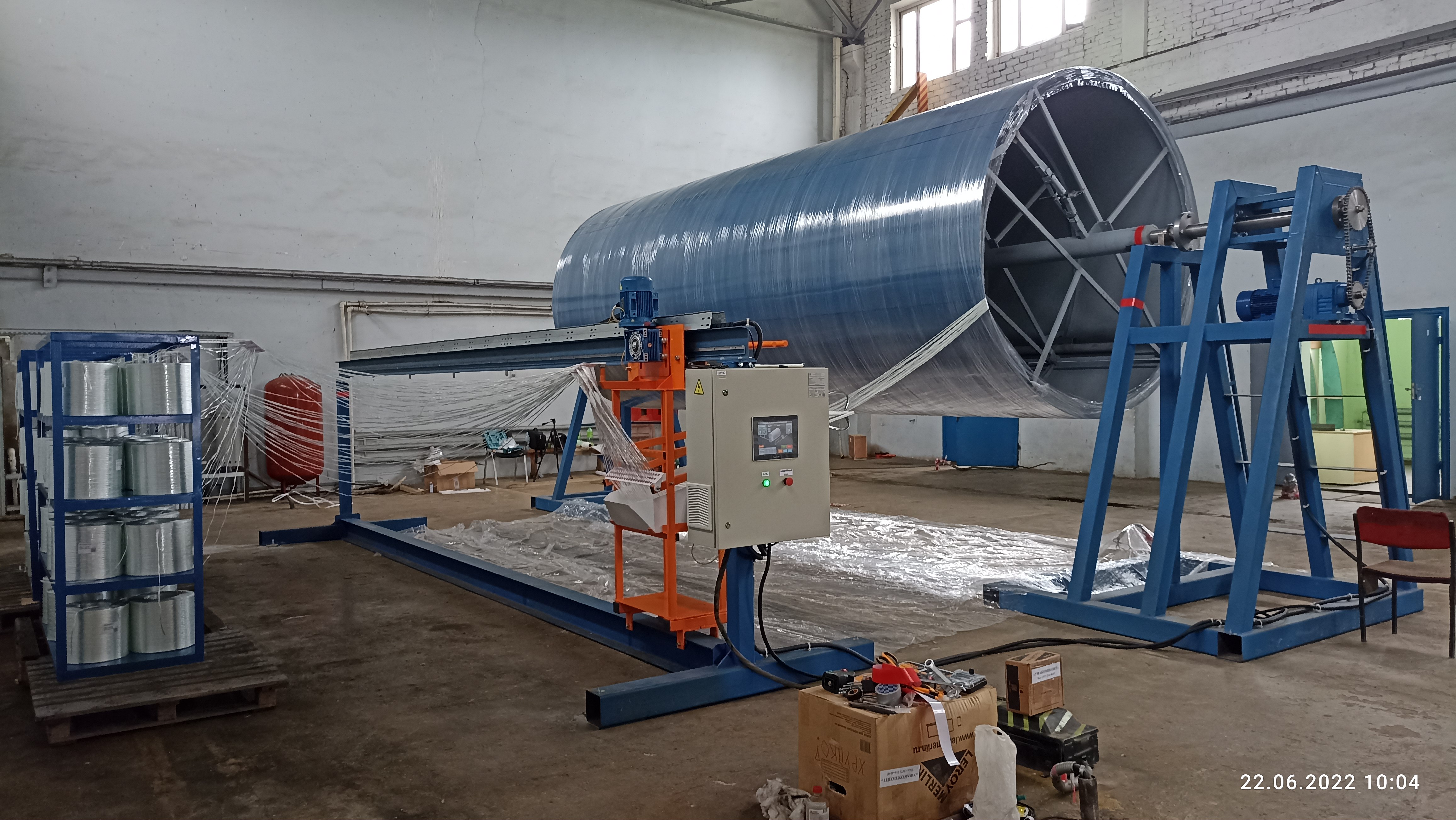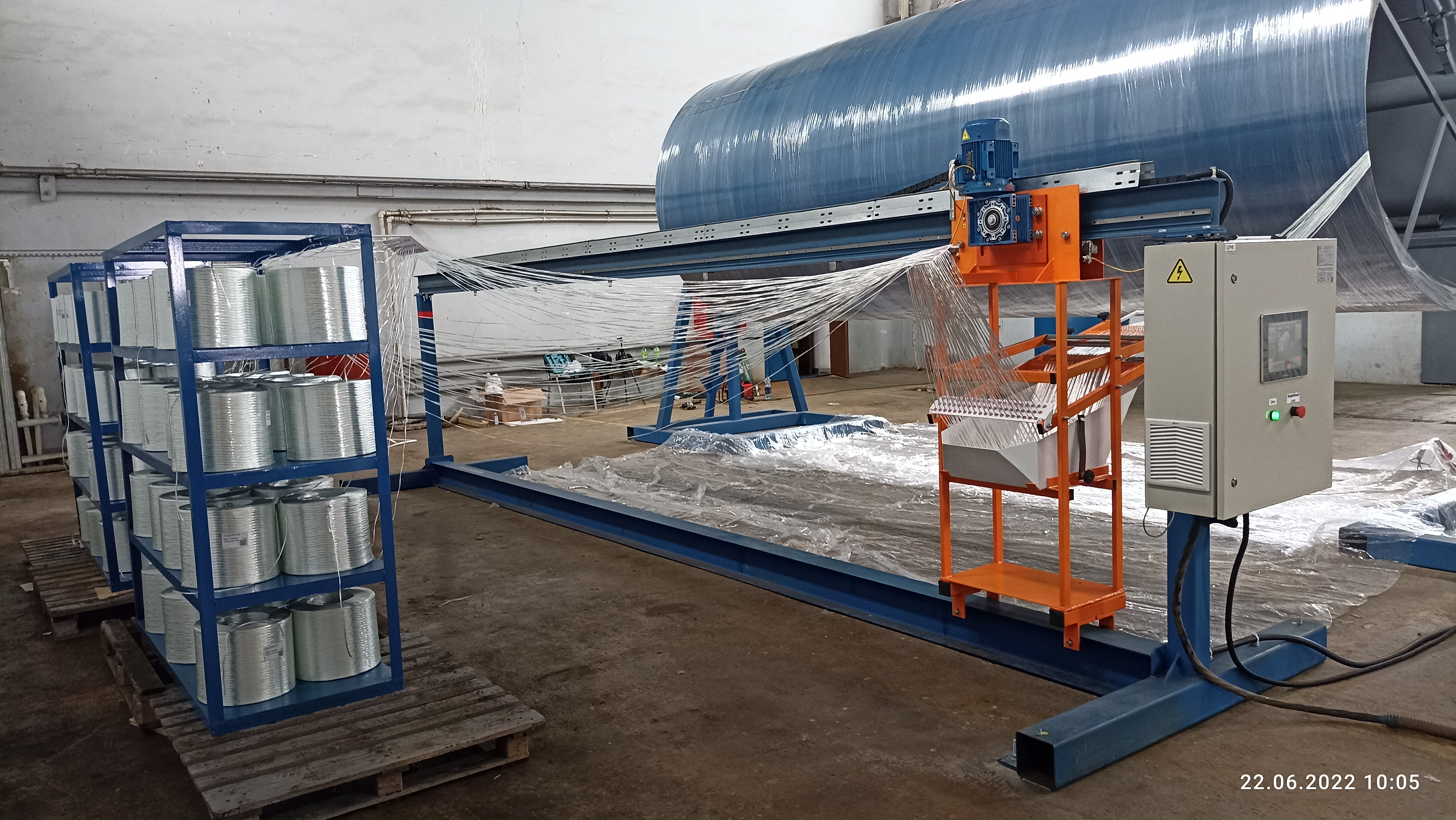 Модель 03-2022 - СТАНОК НАМОТОЧНЫЙ. Станок периодической намотки стеклопластика для изготовления стеклопластиковых трубных заготовок диаметром от Ø600 - Ø3000 мм (возможность увеличения диаметра намотки до 4200 мм - доп. опция*). Длина намотки изделия до 6 м. Оборудование работает на полиэфирном связующем. Управление осуществляется программированием частотных преобразователей на различные алгоритмы работы двигателей станка. Стоимость оборудования и срок изготовления по запросу. Время установки оправки на станок - 10 мин. Время смены оправок - 20 мин. Время сжатия/разжатия оправки - до 1 минуты. Сеть: 380В, 50Гц (возможно 220В, 50Гц). Модернизация 2022 года.