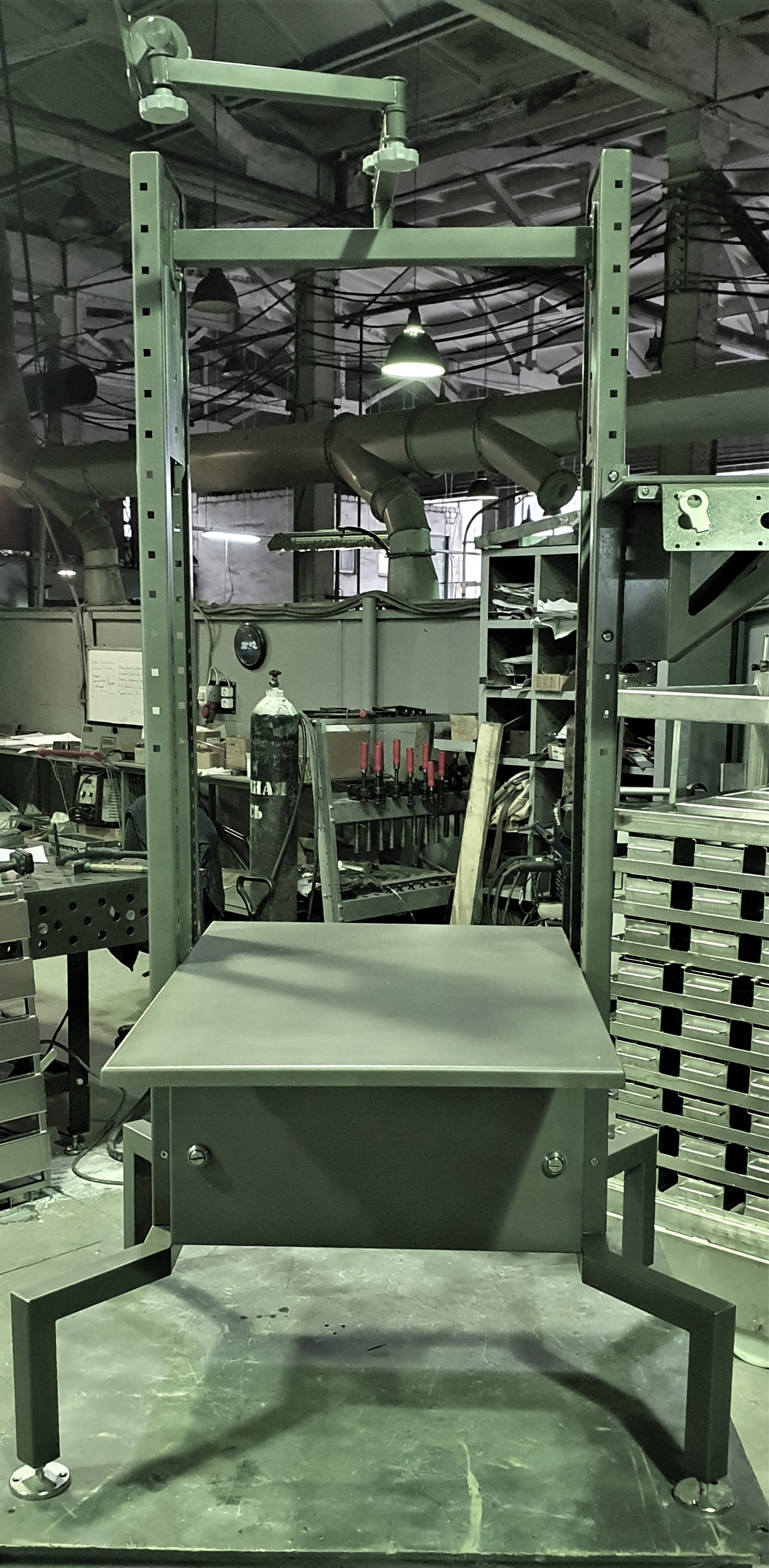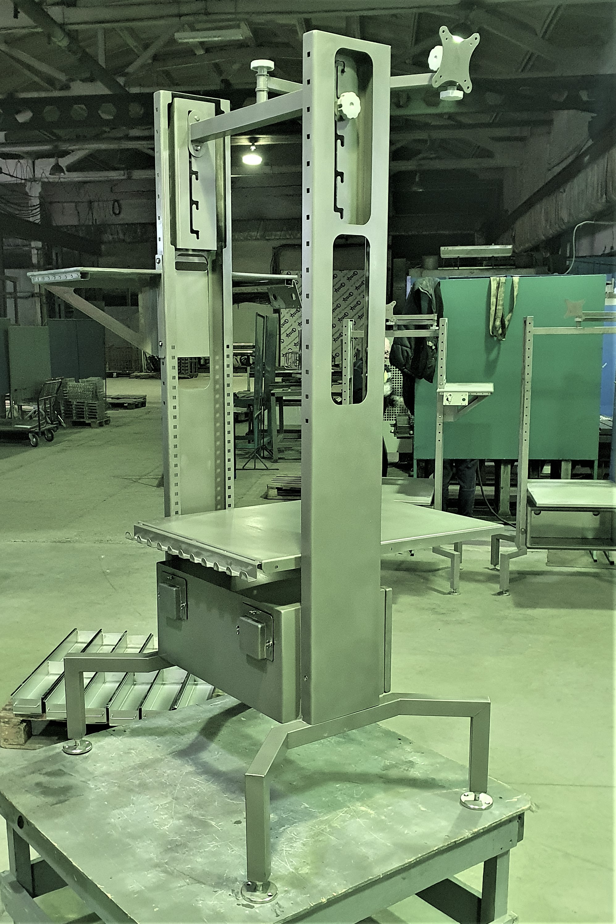Стойка регистрации производственных данных представляет собой многофункциональную металлоконструкцию для размещения на ней оборудования (моноблок, термопринтер, блок питания, весы и др.). Стойки регистрации производственных данных используются в составе ERP систем предприятия.