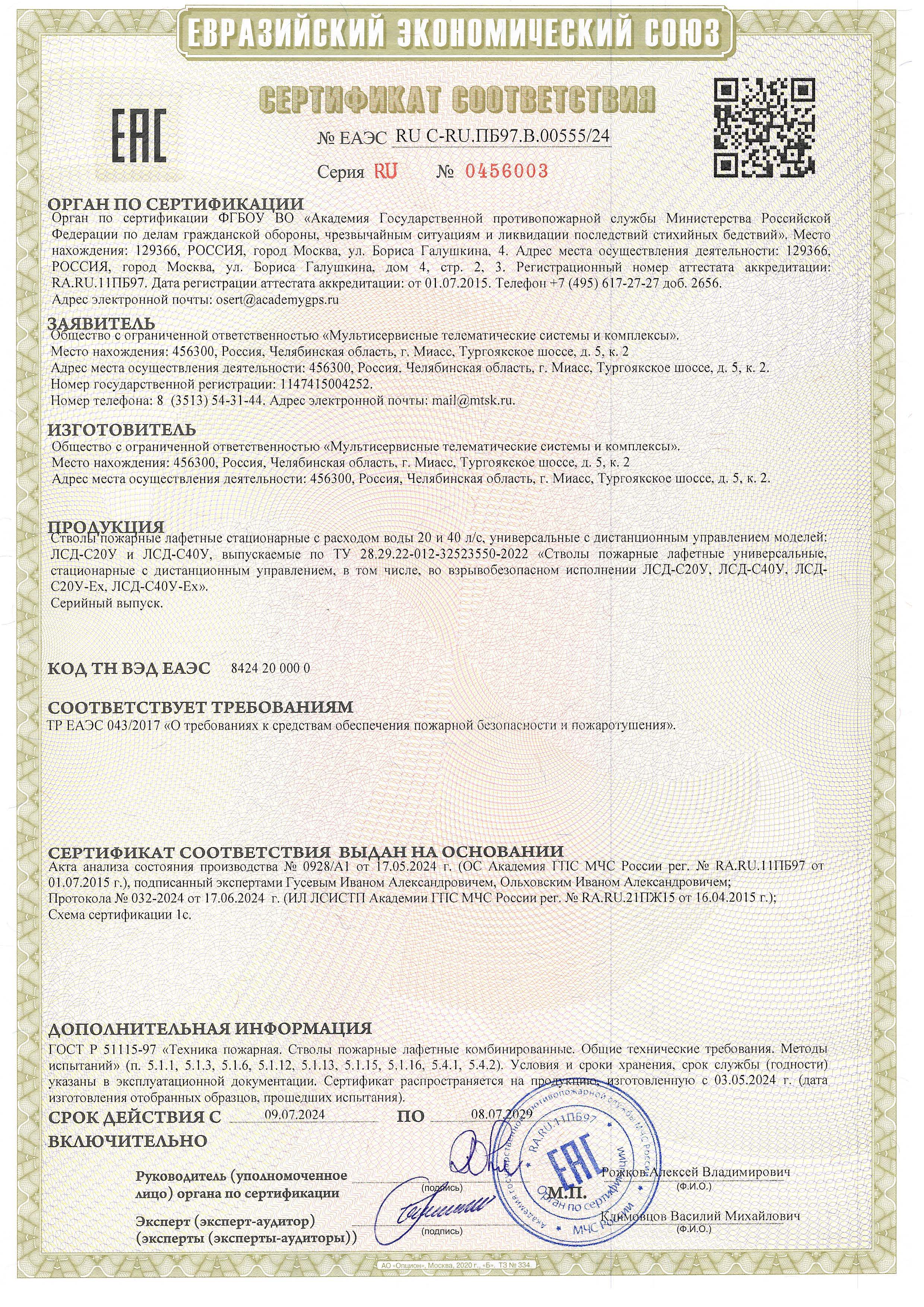 Стволы прошли все испытания, получен Сертификат соответствия № ЕАЭС C-RU.ПБ97.В.00555/24 Серия RU № 0456003 (Протокол № 032-2024 от 17.06.2024 (ИЛ ЛСИСТП Академии ГПС МЧС России регистрационный № RA.RU.21ПЖ15 от 16.04.2015 года).