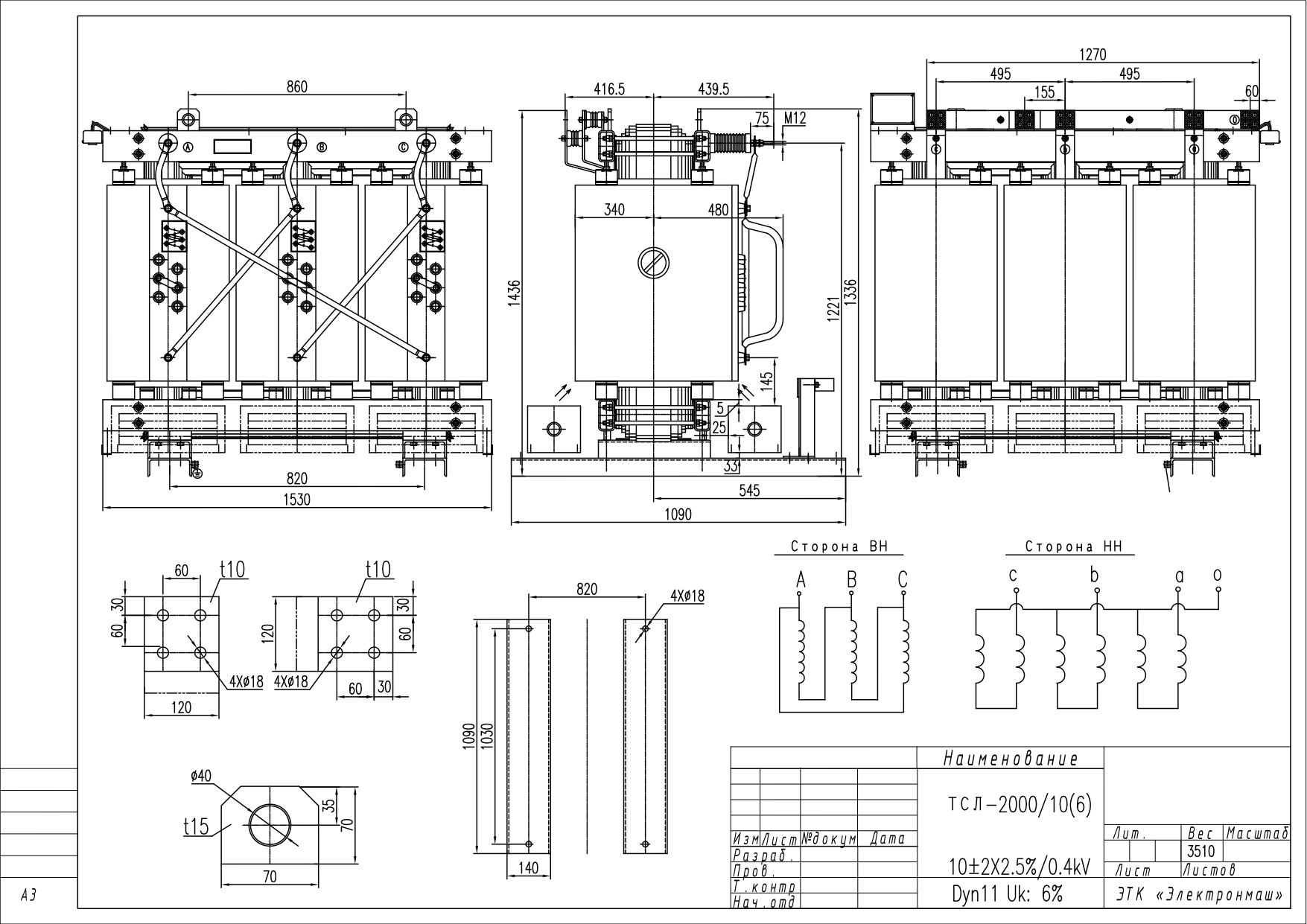 - Вес трансформатора без кожуха ± 10%, кг: 3510