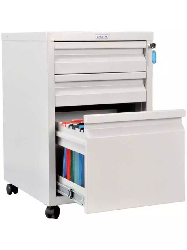 Тумба подкатная BA-65/3 (AP-2) предназначена для организации документооборота в офисных помещениях. Она оснащена одним большим выдвижным ящиком для вертикального хранения документов и двумя небольшими выдвижными ящиками для мелких предметов. Для удобства перемещения тумба оснащена мебельными колесами, а верхний замок обеспечивает надежное запирание.