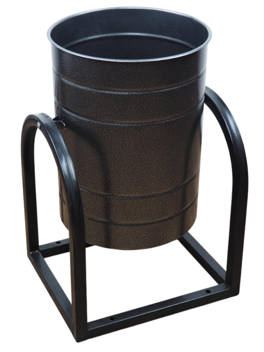 Корпус урны выполнен из прочного листового металла с ребрами жесткости, обеспечивающими дополнительную устойчивость и защиту от деформации. Массивное основание предотвращает опрокидывание даже при сильных порывах ветра или небрежном обращении. Для надежной фиксации предусмотрены монтажные отверстия в основании, что позволяет закрепить конструкцию на асфальтовом или бетонном покрытии.