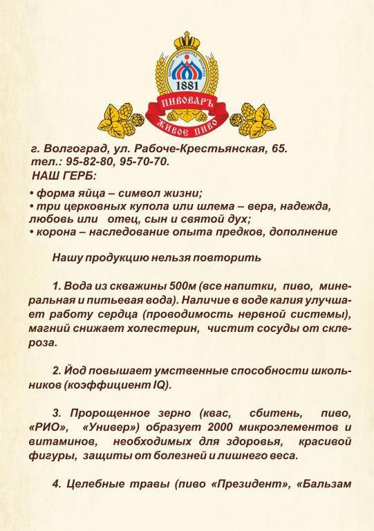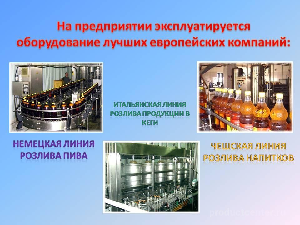Предприятие производит вино, пиво, коктейли и газированные напитки.
