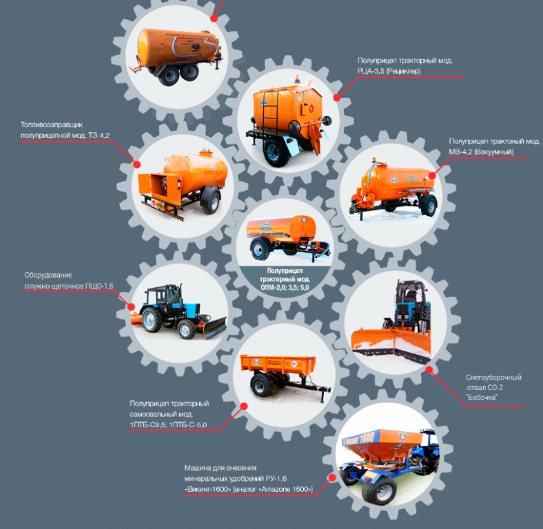 Компания производит сельскохозяйственную технику: для обработки почвы; полуприцепы, погрузчики, оборудование для животноводства и проч.