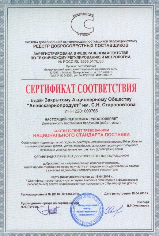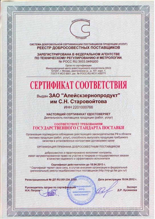 ЗАО «Алейскзернопродукт» им. С. Н. Старовойтова — это мощный зерноперерабатывающий комплекс с полным технологическим циклом от переработки зерна до производства и упаковки продукции. Современные технологии, высокое качество, широкий ассортимент выпускаемой продукции, оптимальные цены, профессиональная команда единомышленников — вот что делает предприятие одним из лидеров мукомольного производства в России.
