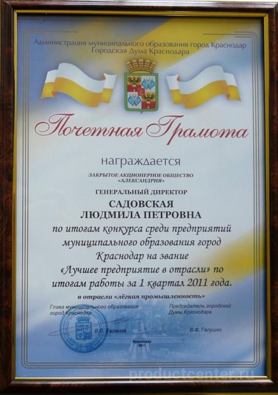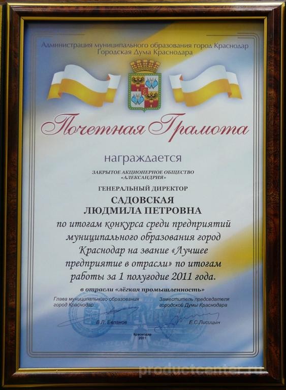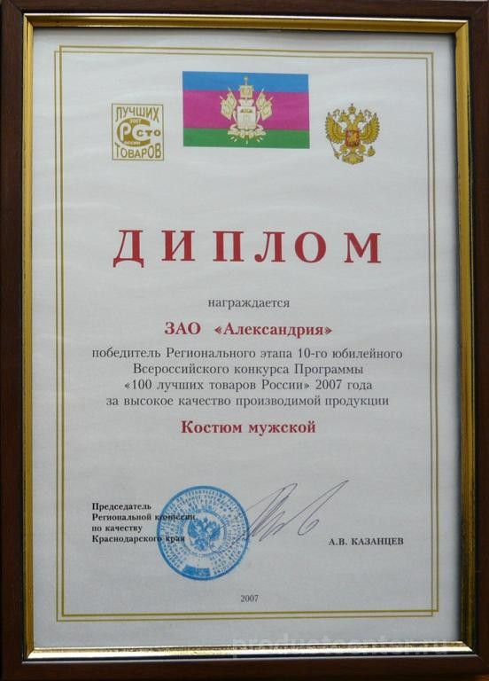 АО «Александрия» является одним из крупнейших швейных предприятий юга России. Богатая история предприятия насчитывает более 87 лет. Компания «Александрия» образована на базе двух Краснодарских фабрик и является правопреемником Краснодарского промышленно-торгового швейного объединения. Основным направлением деятельности компании является производство мужских и детских костюмов, пиджаков, брюк и сорочек, по выпуску которых компания входит в пятёрку лидеров предприятий легкой промышленности России.