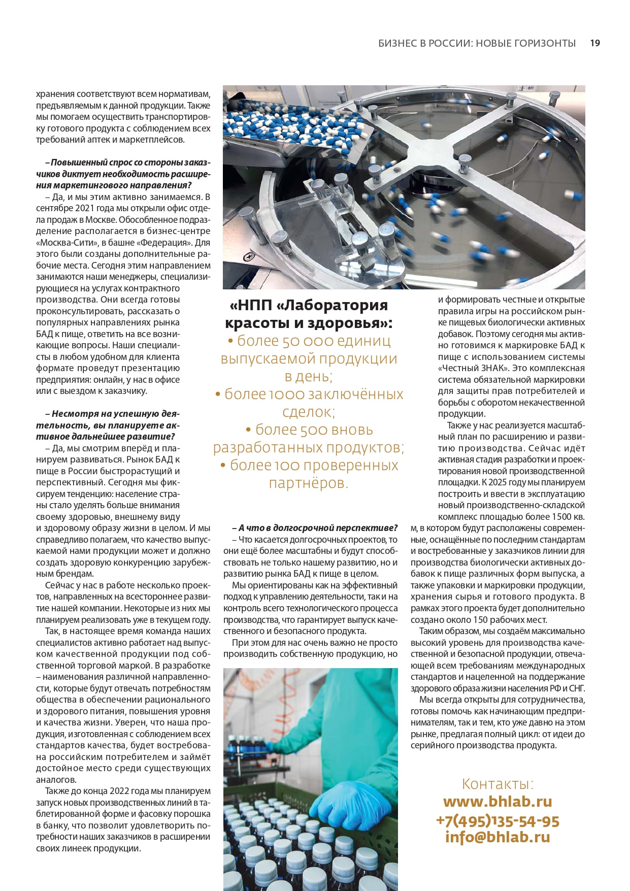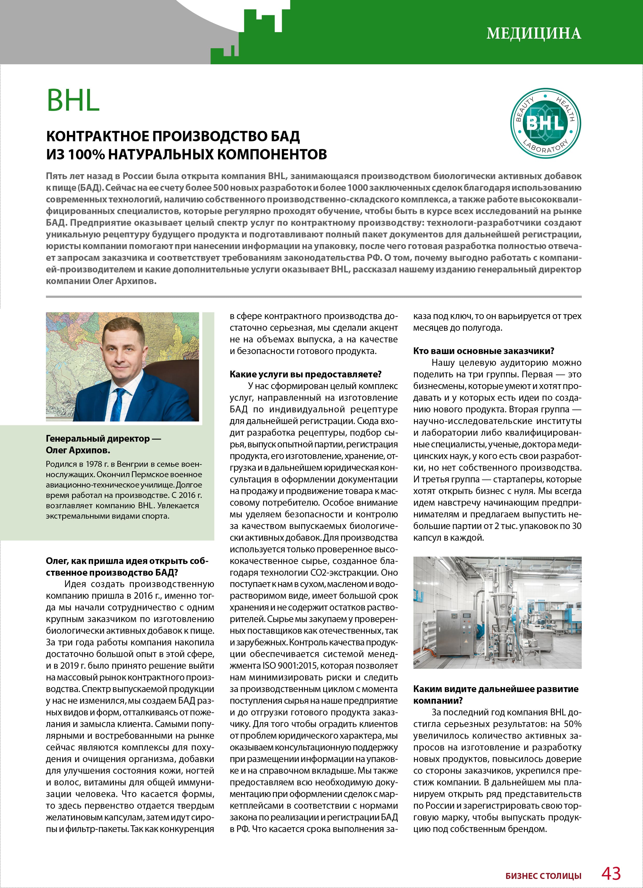 Контрактное производство ООО «НПП «Лаборатория красоты и здоровья» было основано в 2016 г. Производственно-складской комплекс расположен в экологической зоне Подмосковья на территории площадью 2 га. Компания специализируется на разработке, регистрации и выпуске БАД к пище из натурального растительного сырья и спортивного питания следующих форм выпуска: