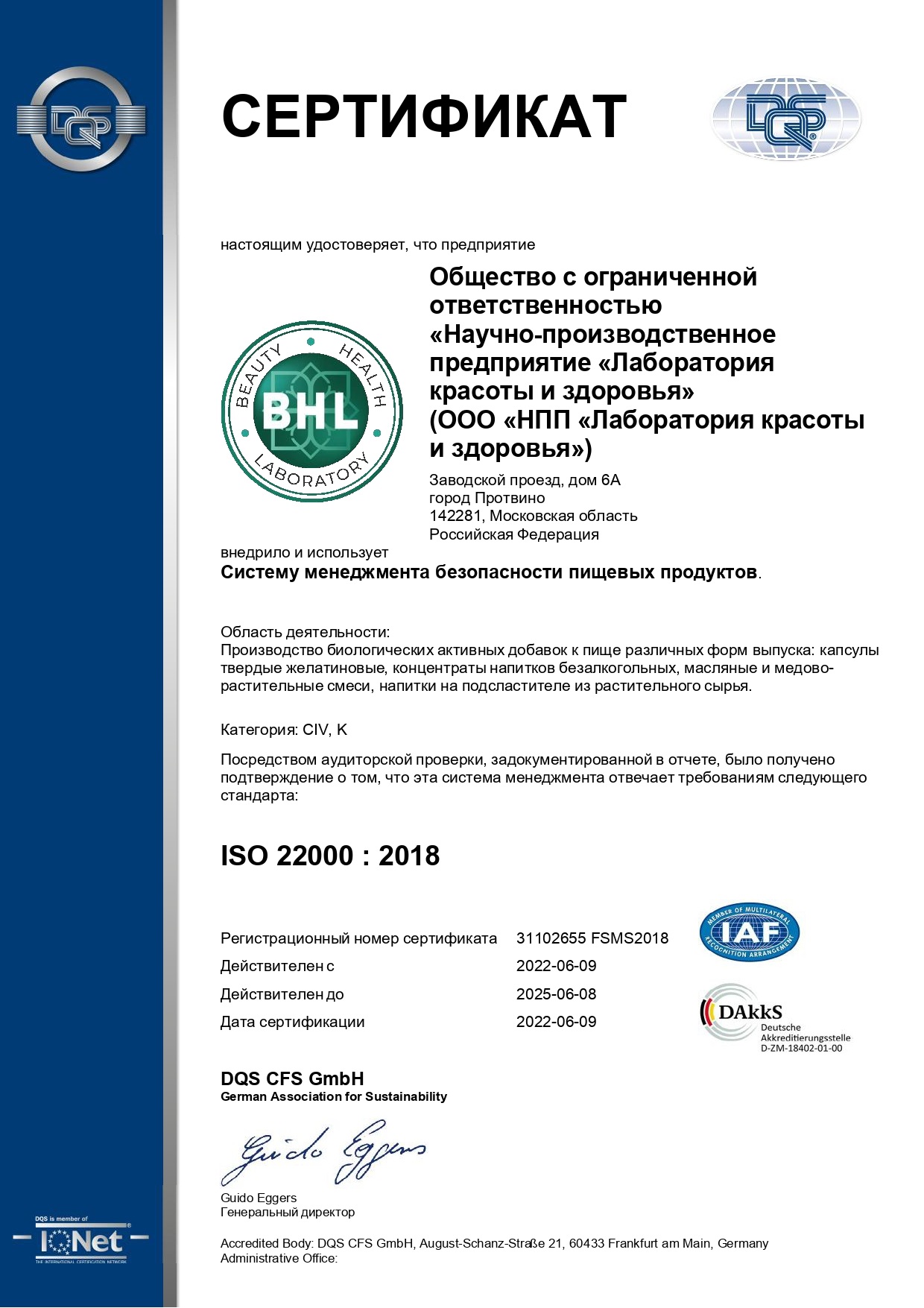 Регулярное повышение квалификации и обучение наших сотрудников, а также тесное сотрудничество с докторами медицинских наук, институтом питания, аккредитованными лабораториями, специалистами в области системе менеджмента качества, способствует нашей вовлеченности и позволяет быть в курсе всех трендов, новых разработок и изменений нормативно-правовой базы и требований системы менеджмента безопасности пищевой продукции на рынке биологически активных добавок.