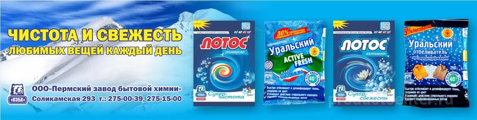 Пермский завод бытовой химии основан в 2005-м г. в Перми. Компания занимается производством и реализацией бытовых и технических чистящих средств. Завод имеет бренд стирального порошка Лотос.