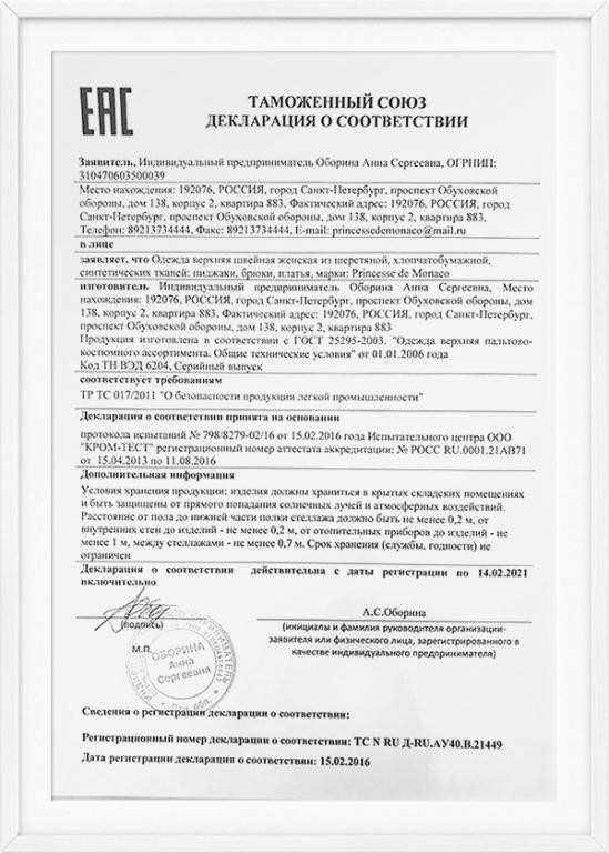 Производитель-поставщик женской одежды «Princesse de Monaco» (бренд Принцесса Монако) предлагает оптовым покупателям, дилерам из регионов России и в шоу-рум продукцию собственного производства по выгодной цене. Швейное производство ООО «Princesse de Monaco» базируется в г. Санкт-Петербург. В компании работает более 25 специалистов. Продажа товаров мелким, средним и крупным оптом. В каталоге фабрики: платья для женщин (теплые осенние) — вечерние, праздничные, офисные, кружевные и пр.; шелковые топы; тренчи и пальто; блузки и юбки; брючные костюмы; жакеты и кардиганы; Размеры: 40-52. Цветовая гамма: крупные принты, кружевные, однотонные модели. Преимущества бренда: качество одежды соответствует ГОСТу; производим более 600 моделей в год; более 100 моделей в сезонном ассортименте, изготовленных с применением стилевых направлений сезонной моды; выпуск каждой модели в 3-5 расцветках; для пошива серий изделий используем натуральные ткани из Дубая, правильные лекала; мастера и специалисты фабрики обучаются в Европе.