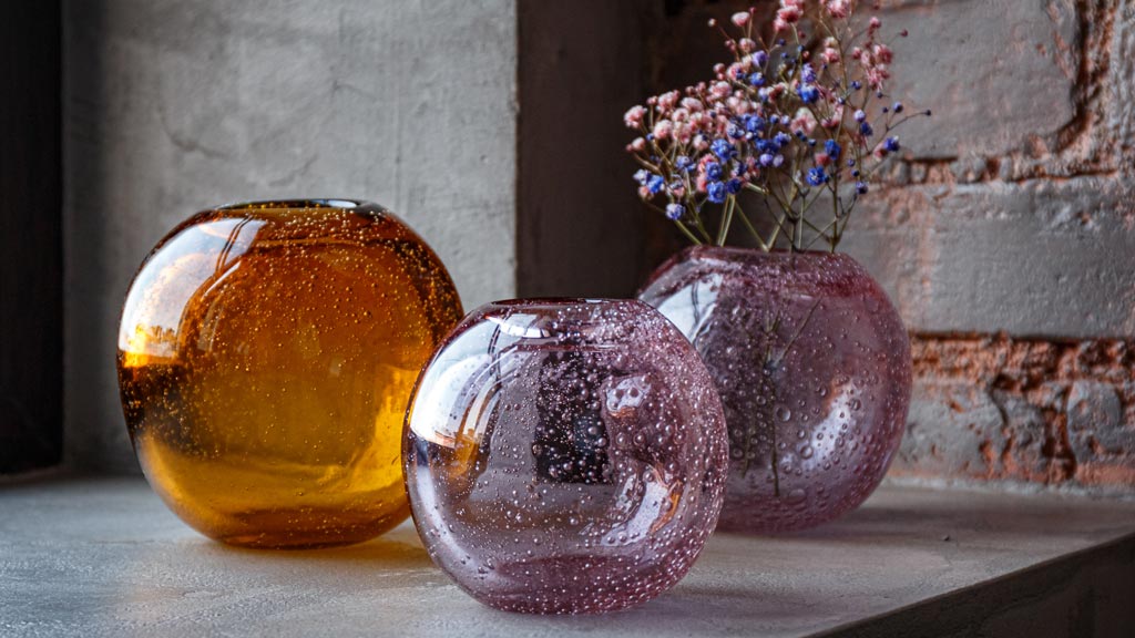 7. Стеклянные цветочные композиции разных размеров для декора помещений.