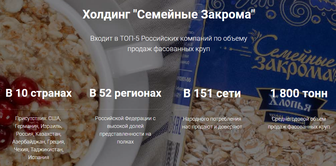 Компания «Семейные Закрома» занимется производством фасованной крупы в г. Новосибирске, Новосибирской области. Компания открыла представительства в 10 странах Европы и Азии. Поставки продукции в 52 региона России. В каталоге производителя: рис и пшено; гречка и горох; манка; овсяные хлопья; перловка и др. Продукция сертифицирована.